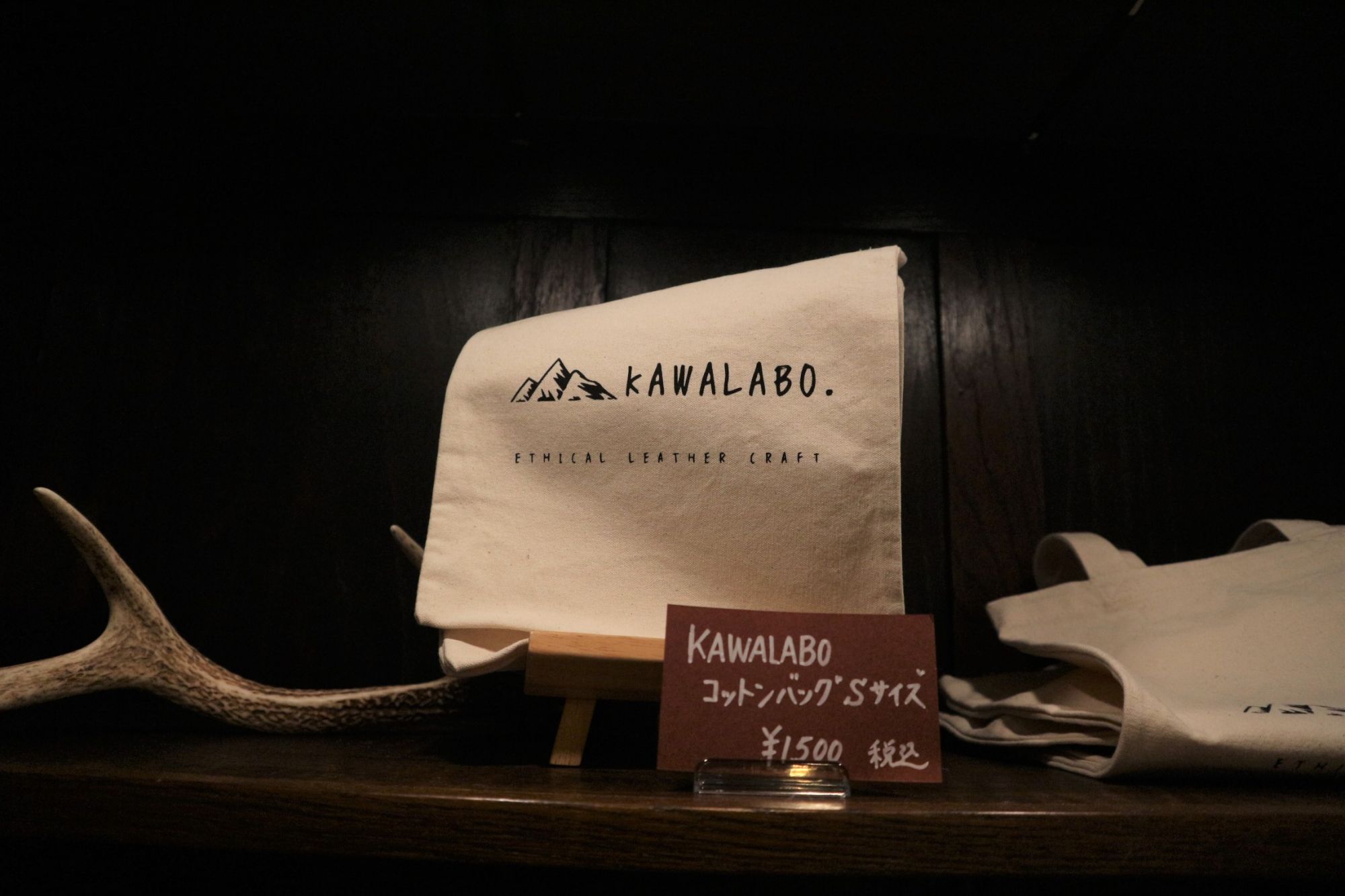 店内は、アウトドアの雰囲気 木のベンチ、木の壁には、カモシカの壁掛け時計・斬新なノコギリのオブジェ