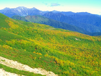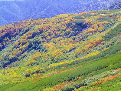 コチラは、標高2700mの県境まで上がって撮った富士見沢の画像です。この辺りも少しずつ赤い色合いが見れるようになって来ていました。毎年紅葉の時期に真っ赤になるナナカマドは、まだまだこれからのようですね・・・。来週一週間ぐらいが見頃になるのではないでしょうか?