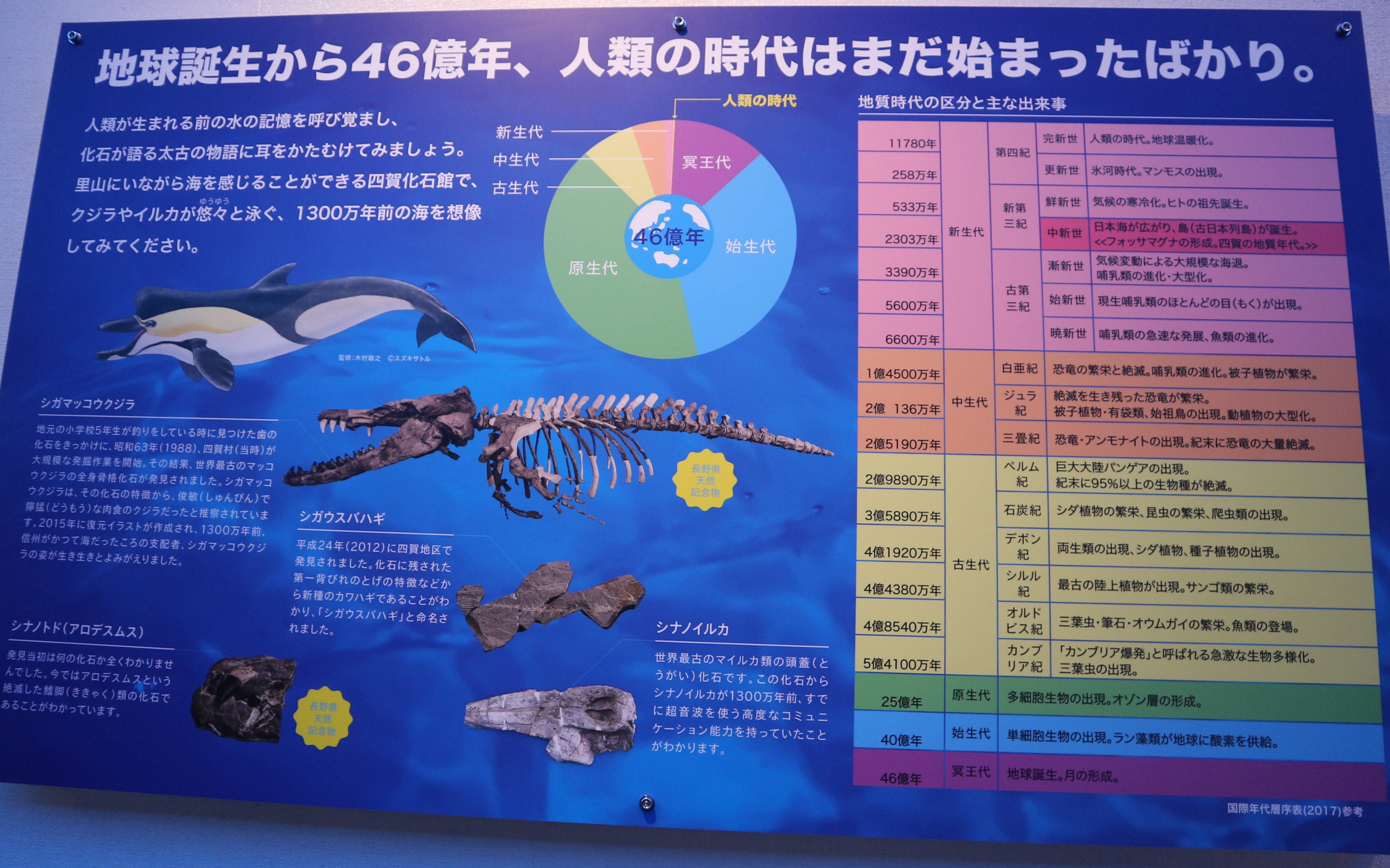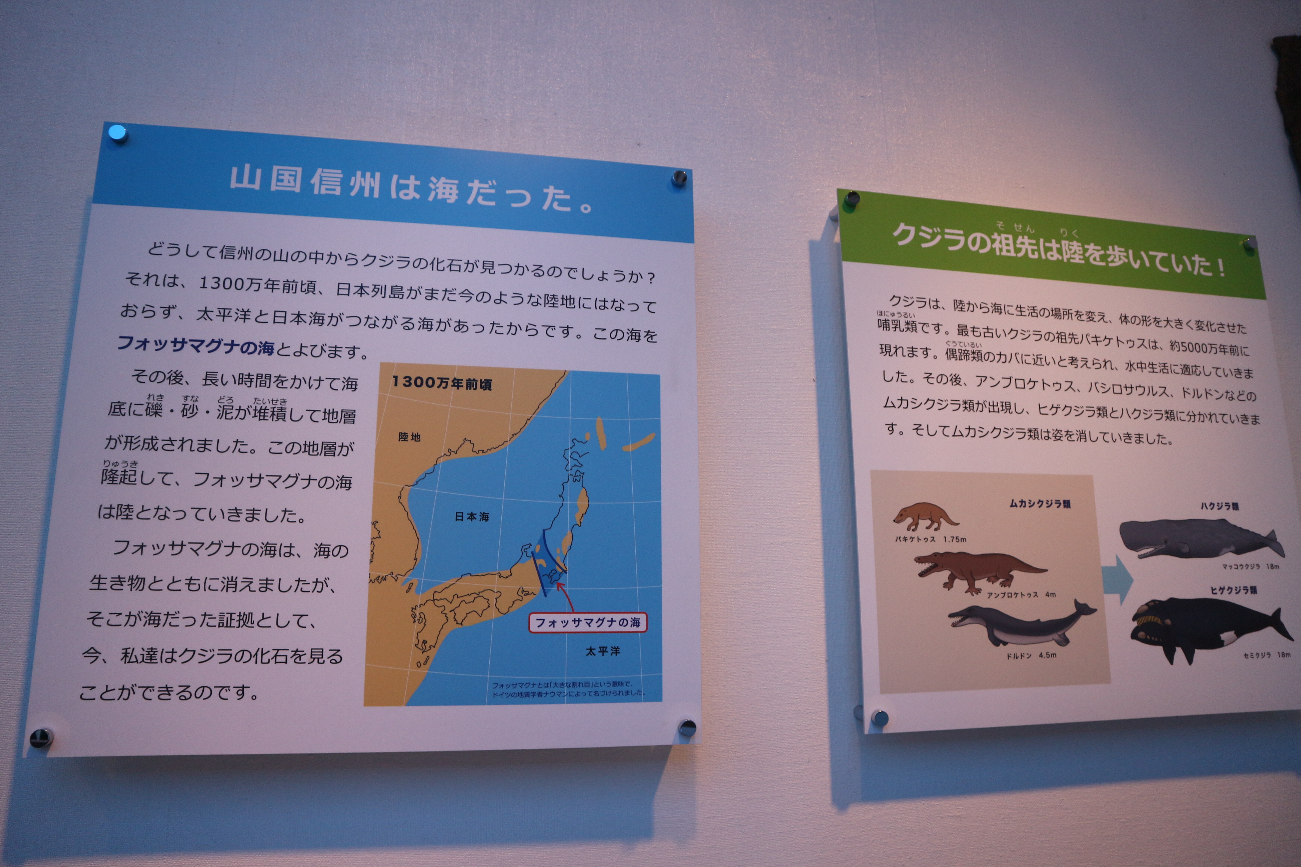 これは環太平洋で2例目、全身骨格としては世界最古の大発見となり、シガマッコウクジラと名付けられました。四賀化石館は、このクジラの全身骨格化石をメインに、旧四賀村内外から採集されたクジラ類やアロデスムス、貝、植物などの化石を収蔵・展示する目的で1989年(平成元年)に開設されました。(化石館HPより)