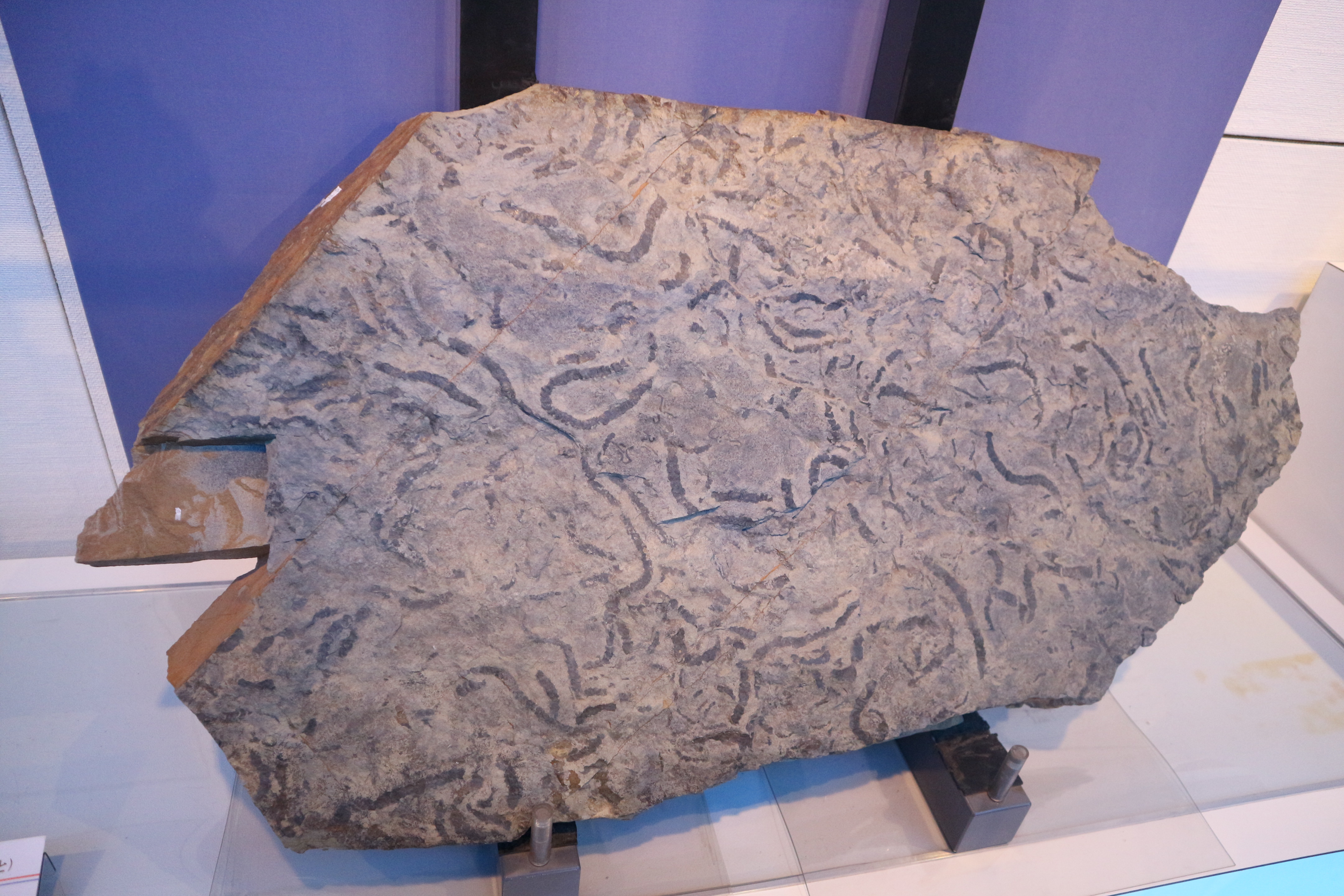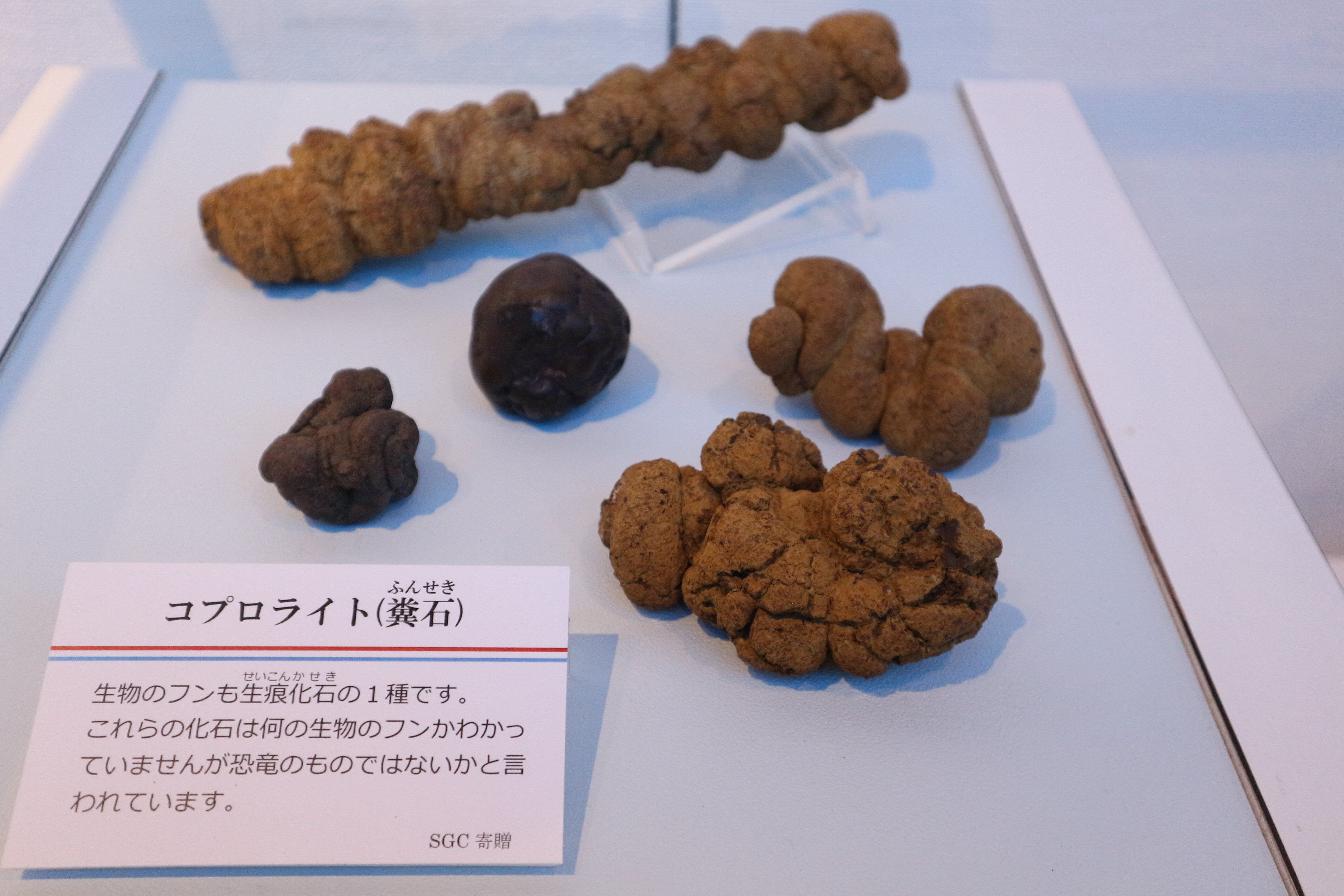 生物の糞の化石「コプロライト(糞石)」 植物の葉も展示されています。