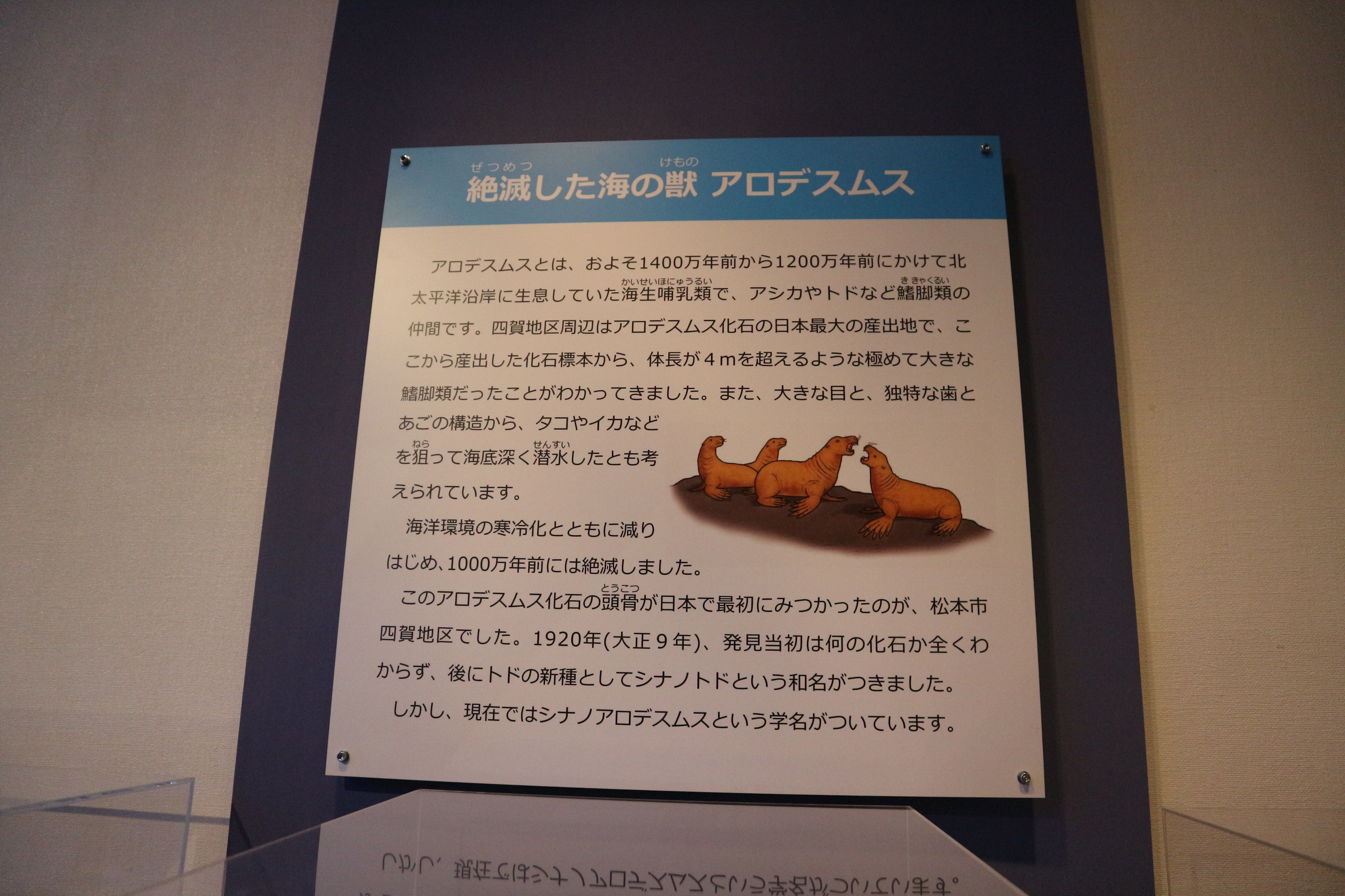 このアロデスムス化石の頭骨が日本で最初にみつかったのが四賀地区でした。1920年(大正9年)、発見当初は何の化石か全くわからず、後にトドの新種としてシナノトドという和名がつきました。しかし、現在ではシナノアロデスムスという学名がついています。