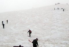バスの窓から雪の壁を見上げて感嘆し、真夏まで雪が残る「乗鞍大雪渓」に着きました。バスで同乗して来た人たちが、スキーやスノーボードをかついで登って行きます。以前、このバスで来て、乗鞍岳山頂まで春山登山したことを思い出しました。