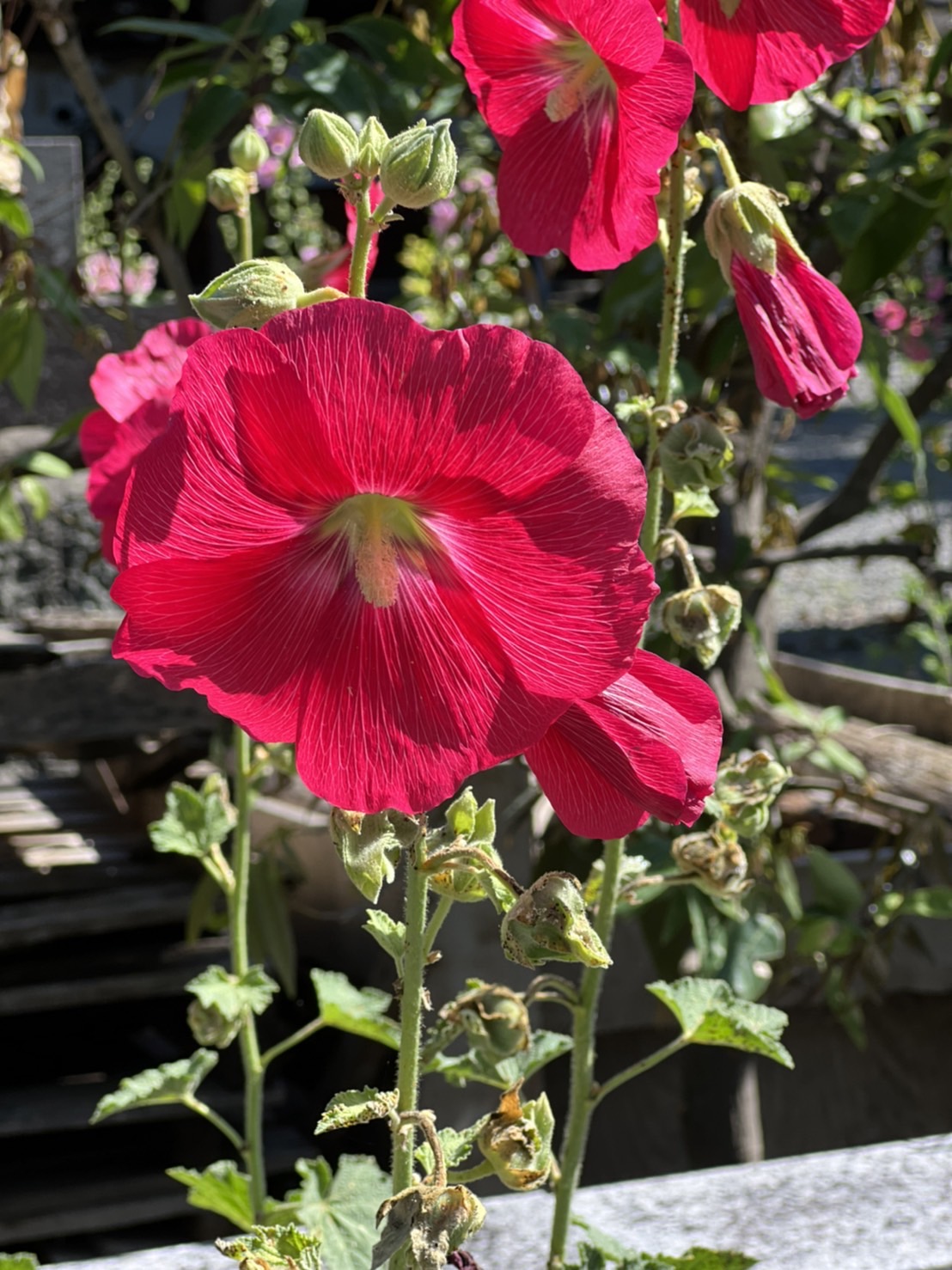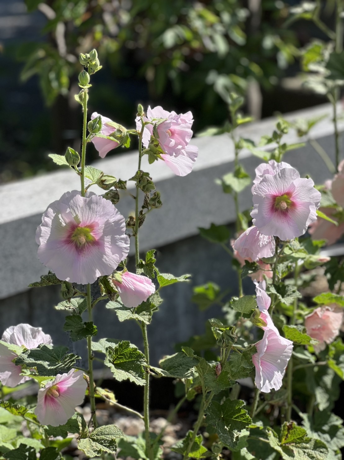 タチアオイは、下から順番に花が咲きます。1番上まで咲いたら梅雨が明けると言われています。