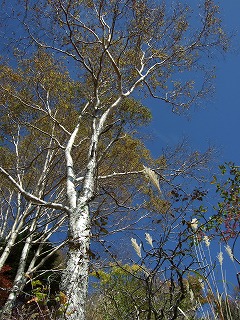 日差しを受けて銀色に輝くダケカンバの幹。あまりにも美しくてしばらく見入って動けなくなってしまいました。写真ではわからないと思うので是非見に行っていただきたいものです。