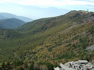 アルプス展望コースの途中の烏帽子岩からの眺め。カラマツの黄葉はこれから楽しめます。
