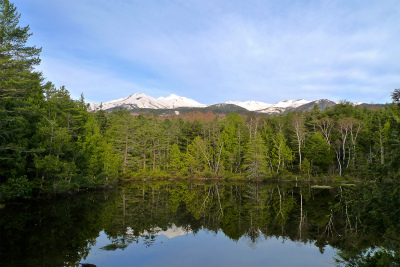 5月9日朝の牛留池の様子です。乗鞍高原の休暇村から歩いてすぐの場所にあり、眺めも最高です。無風の時には水面に乗鞍岳が逆さに映るので、人気があります。