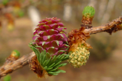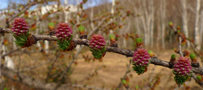 乗鞍高原にたくさん植林されている「カラマツ」の樹にもお花が咲いています。