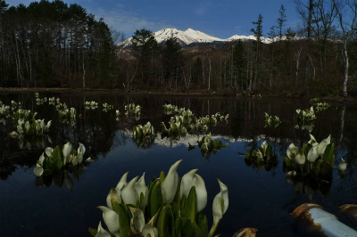 これは一ノ瀬園地のどじょう池で撮影しました。青い空色を映した池に白い水芭蕉が咲いている光景は、この時期ならでは。晴れていれば残雪の乗鞍岳も正面に見えますよ。