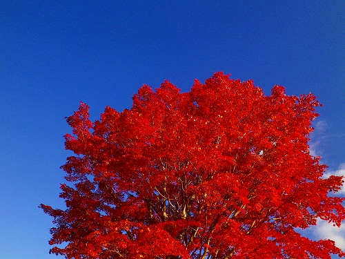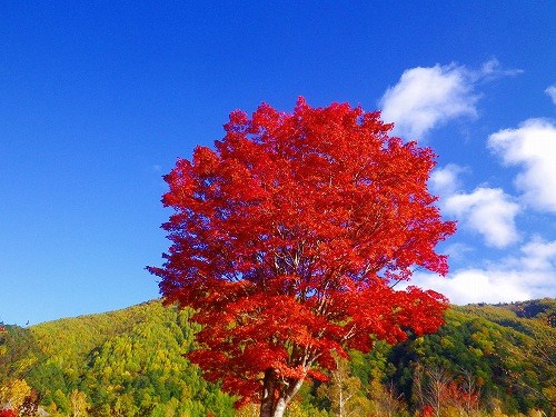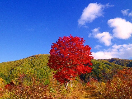 この樹は乗鞍高原・一ノ瀬園地の中に1本だけ大きく立っていて、紅葉の時期には真っ赤に染まるので、とても美しく見えます。「コハウチワカエデ」という種類のカエデらしく、何とも言えない程の深紅の色になるのです。