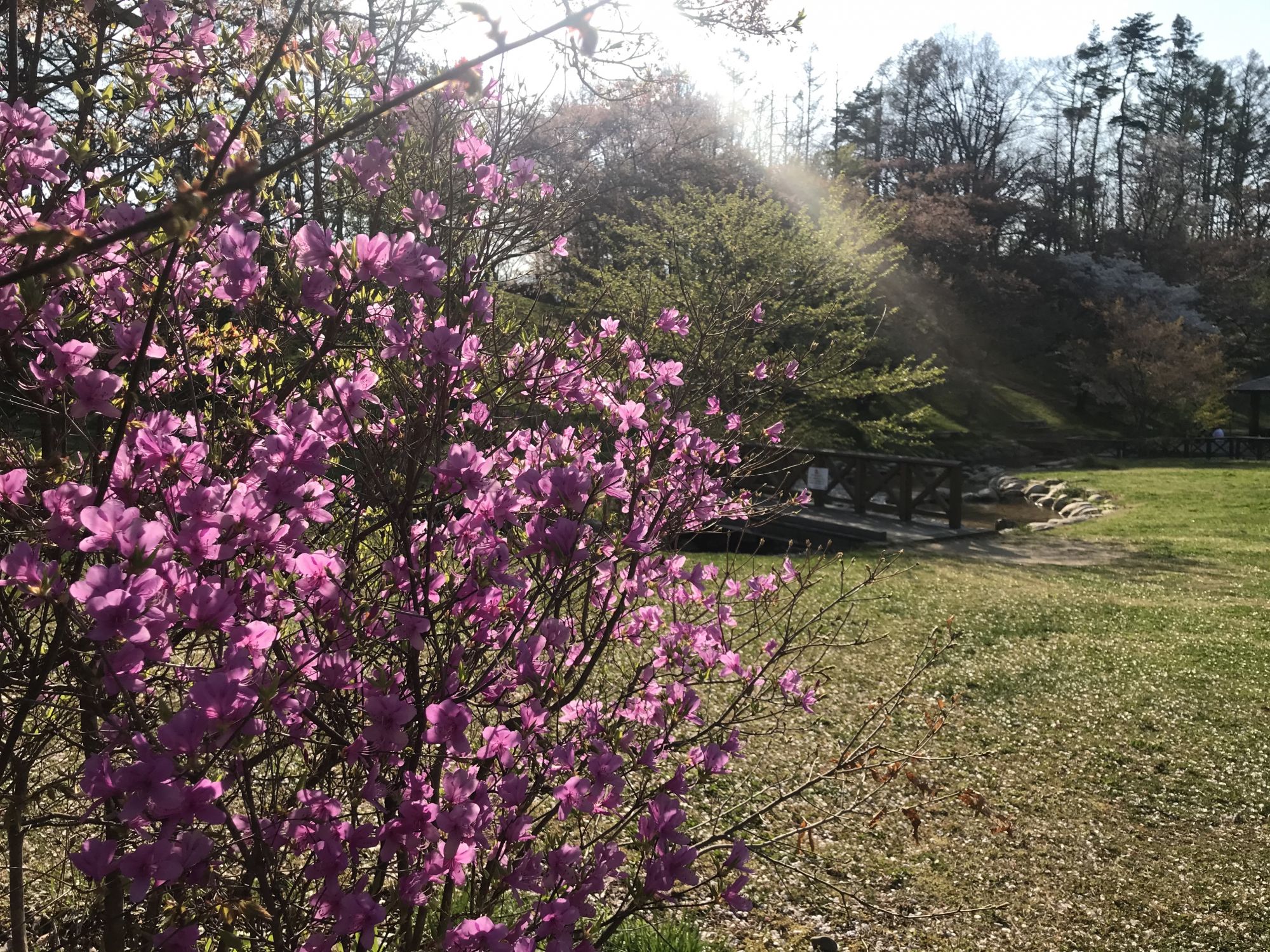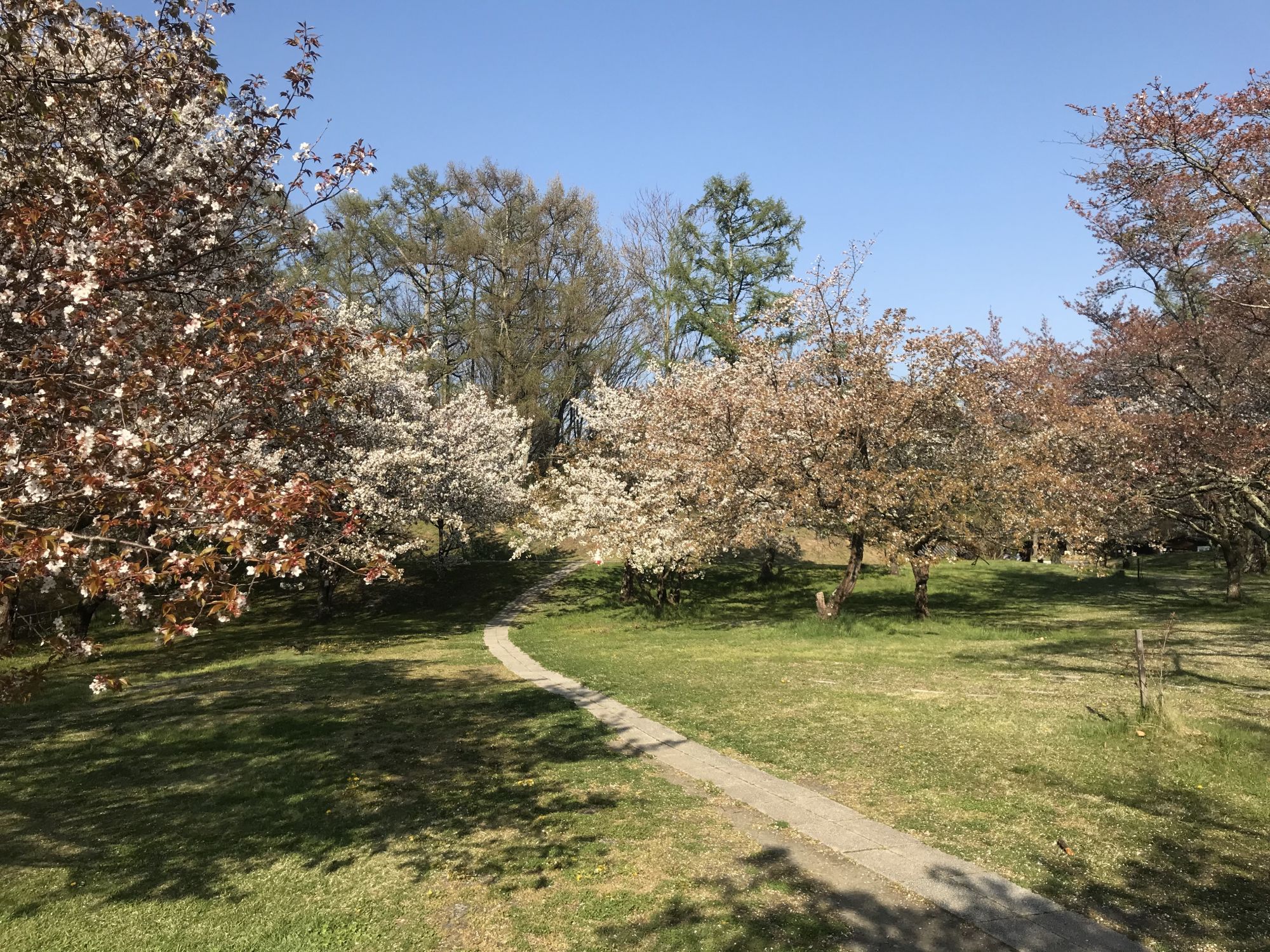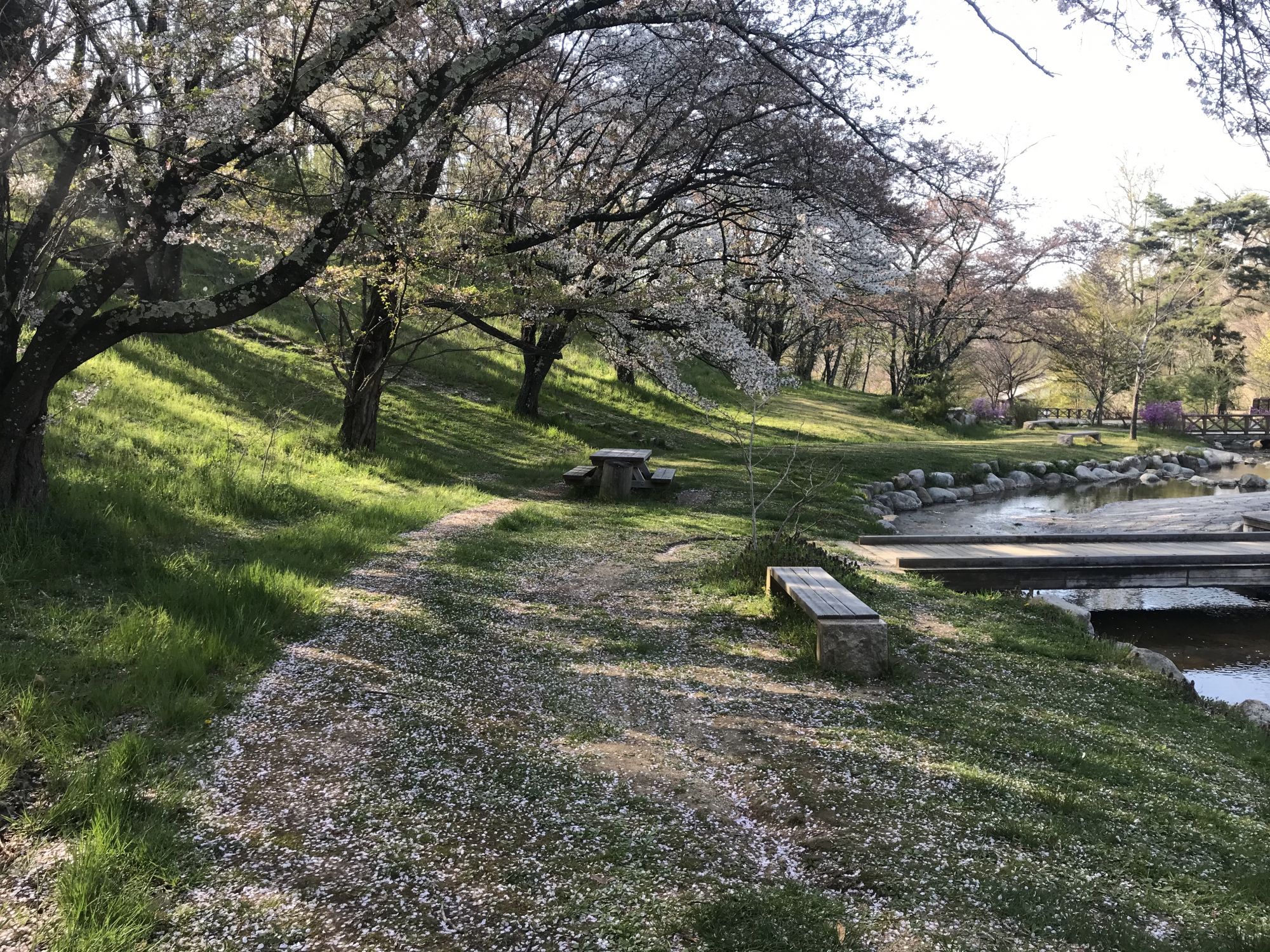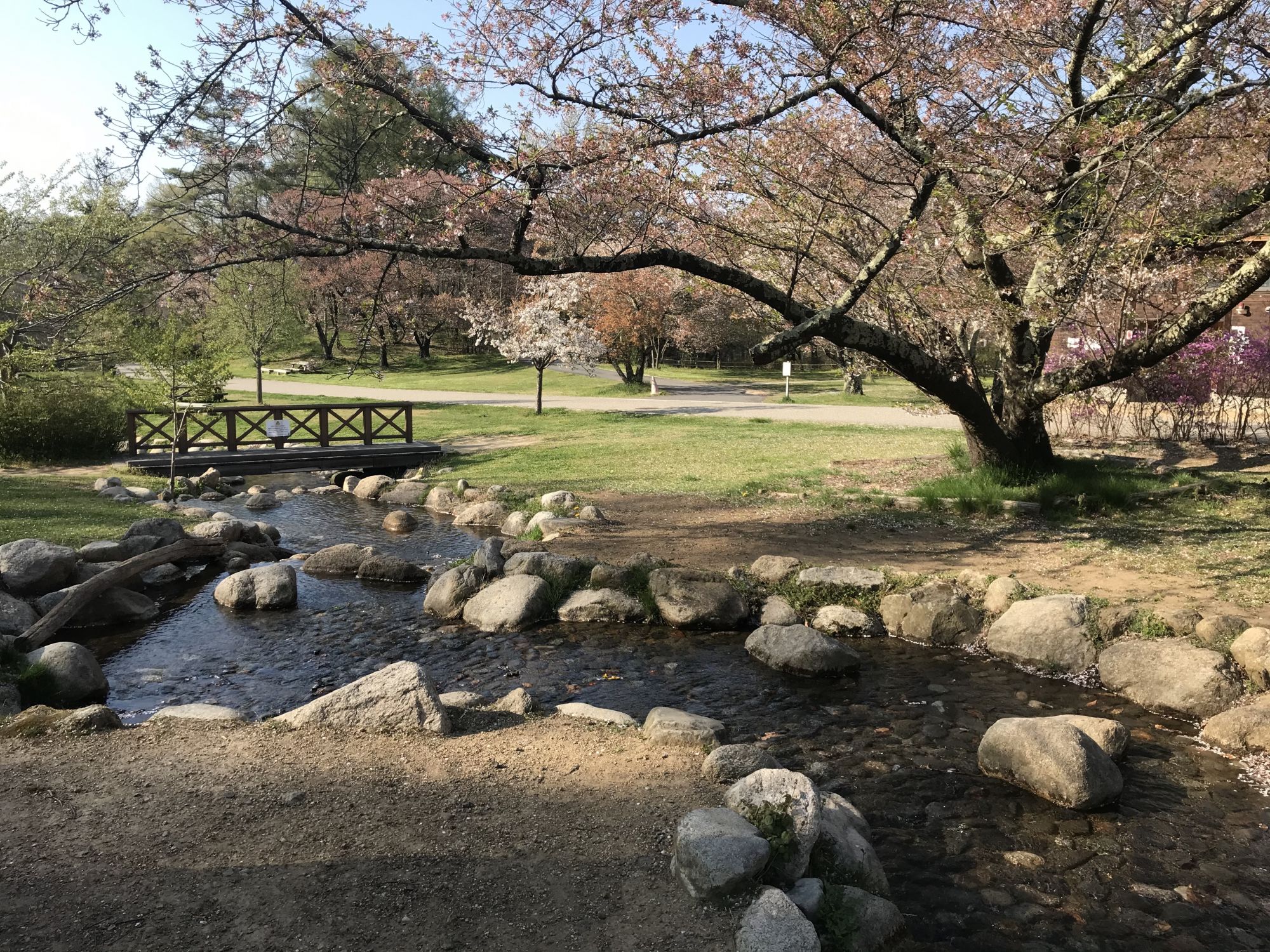 Альпс-парк одно из тех мест, где даже в начале мая все еще можно полюбоваться цветением сакуры. Вернее сказать, финальными аккордами этого волшебного зрелища, которое носит название «сакура фубуки» (桜吹雪)что в дословном переводе обозначает метель сакуры.