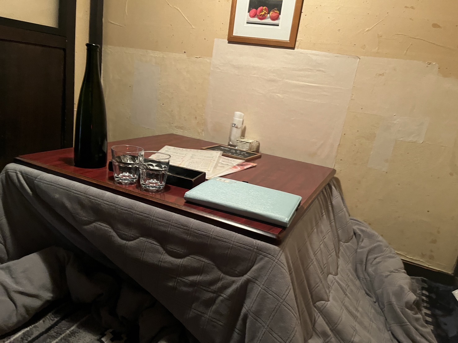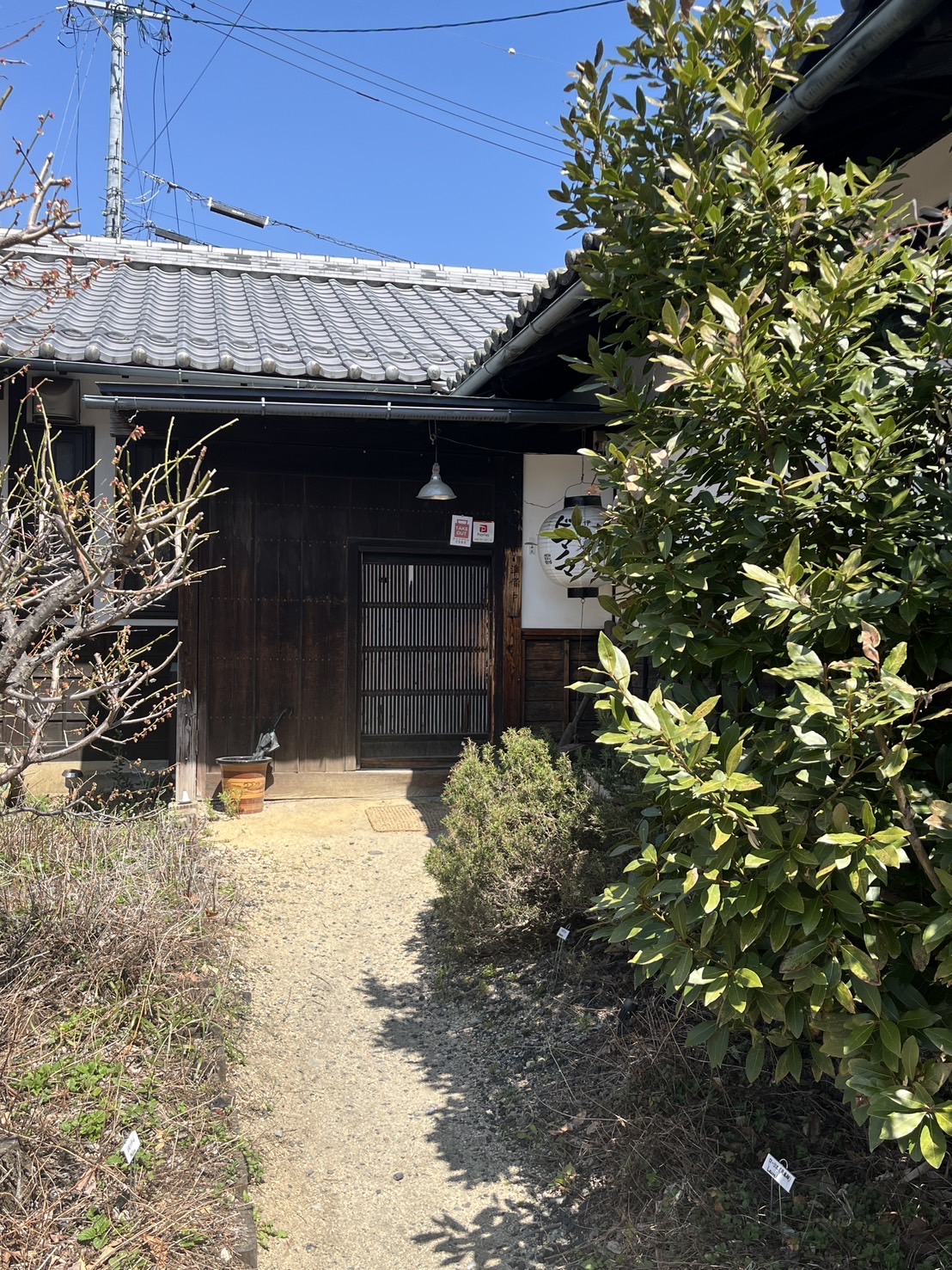 Деревянный каркас строения , несет следы времени: балки и колонны с видимой текстурой натурального дерева сохраняют тепло и уют ушедшей эпохи. Крыша с глубоко свисающими карнизами, покрытая черепицей придаёт зданию аутентичный облик. Низкие потолки с массивными балками — типичная особенность старинных японских домов, создающая камерную, тёплую атмосферу. Раздвижные двери (сёдзи и фусума) используются в интерьере, чтобы зонировать пространство и пропускать мягкий рассеянный свет. Пол с татами где в обеденной зоне предлагается сесть на подушки (дзабутон) у столов с углублениями для ног (хори-готацу).В зимний период устанавливаются котацу — низкие столы с подогревом, накрытые одеялом, что особенно ценится японскими посетителями.