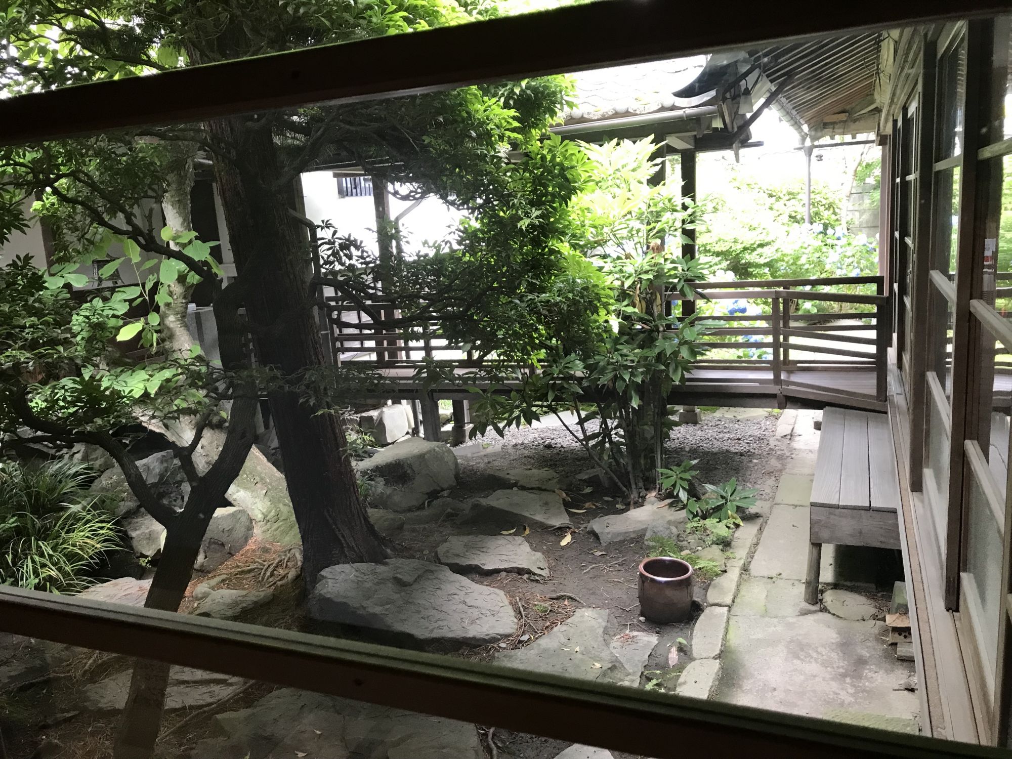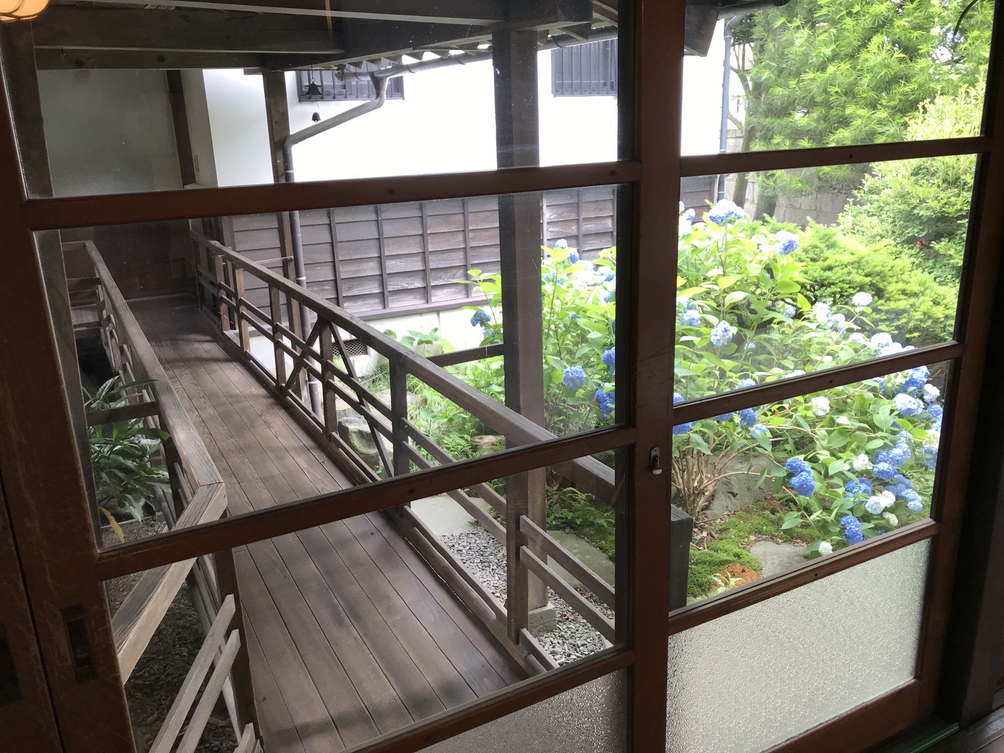 Дом построен в лучших традициях 19го века, из больших окон деревянной трассы открывается вид на уютный японский садик. Сейчас , в сезон дождей здесь цветёт прекрасная гортензия. Стоит отметить, что сад специально был разбит в северной части дома, что бы обжигающие солнечные лучи не попадали в окна, а преломляясь о высокую крышу строения мягко освещали зеленое убранство.  Деревянная дорожка — мостик ведет из дома в соседнее здание.