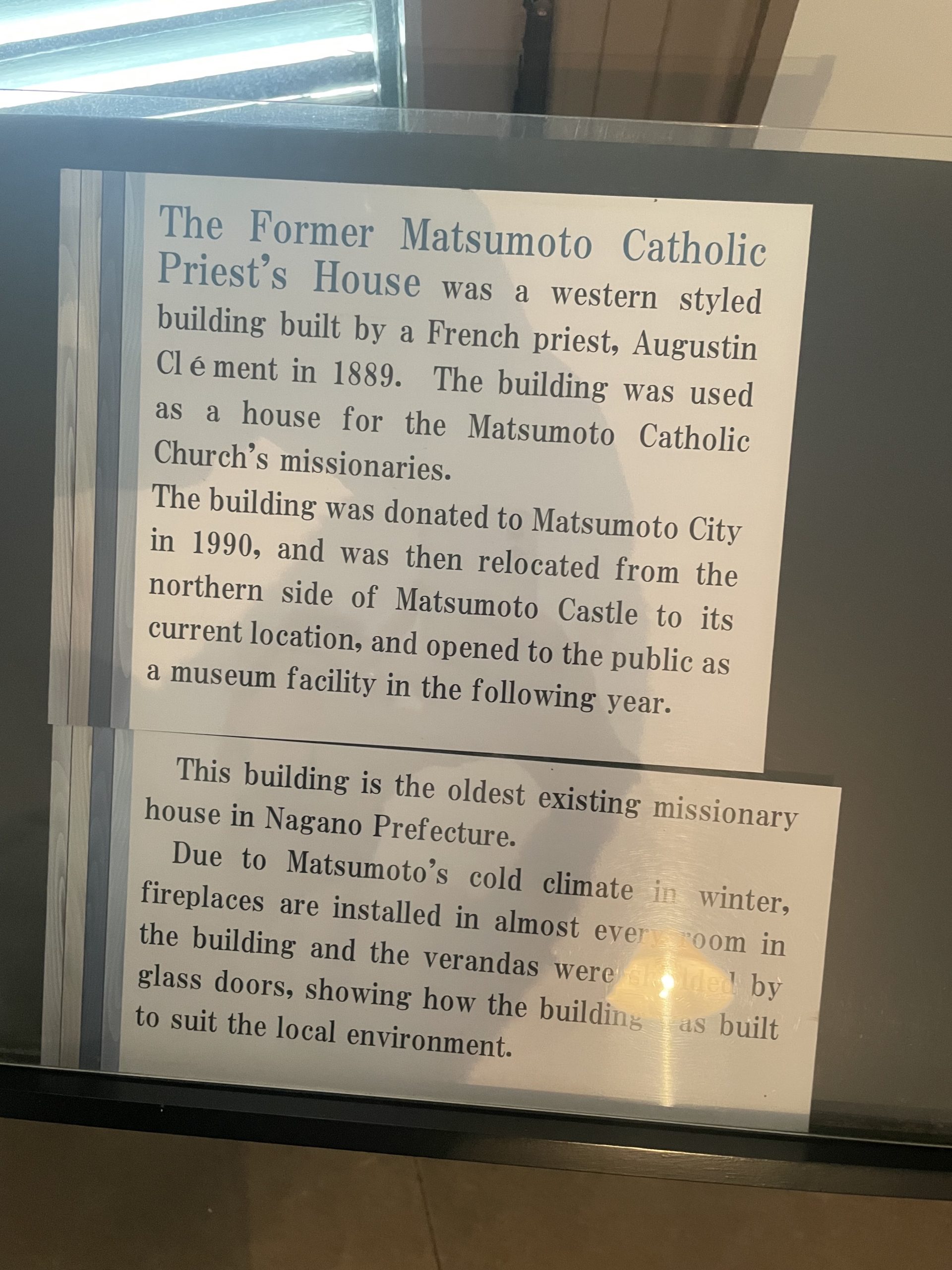 Старое здание римско-католической резиденции священника в Мацумото было построено в 1889 году французским католическим священником Августом Климентом (Auguste Clément) для проживания миссионеров. Здание представляет собой редкий для Японии пример западного деревянного дома конца XIX века — снаружи оно облицовано горизонтальными досками , что напоминает стиль ранней Америки. В течение почти столетия это здание служило жильём для священников католической общины Мацумото.