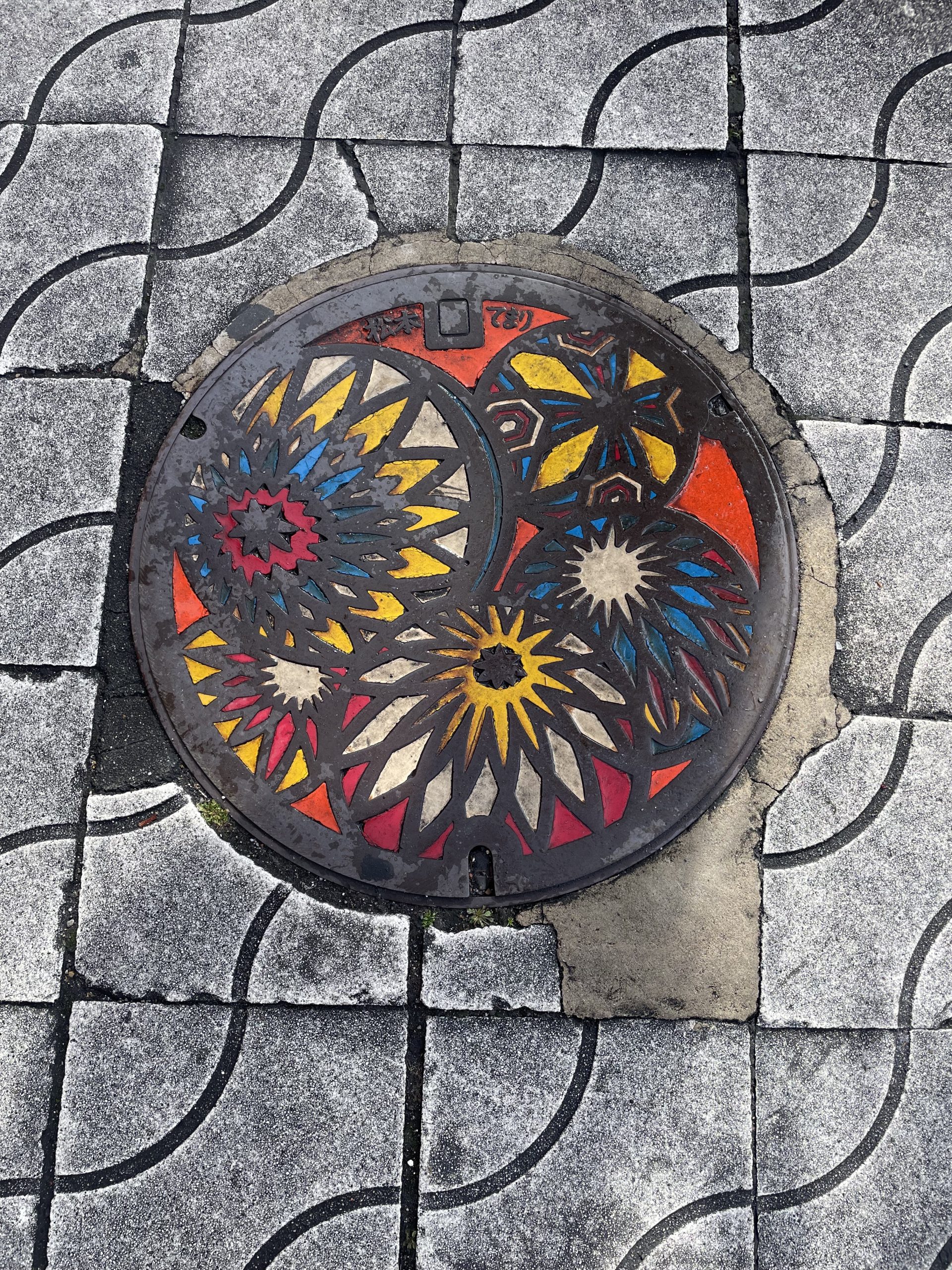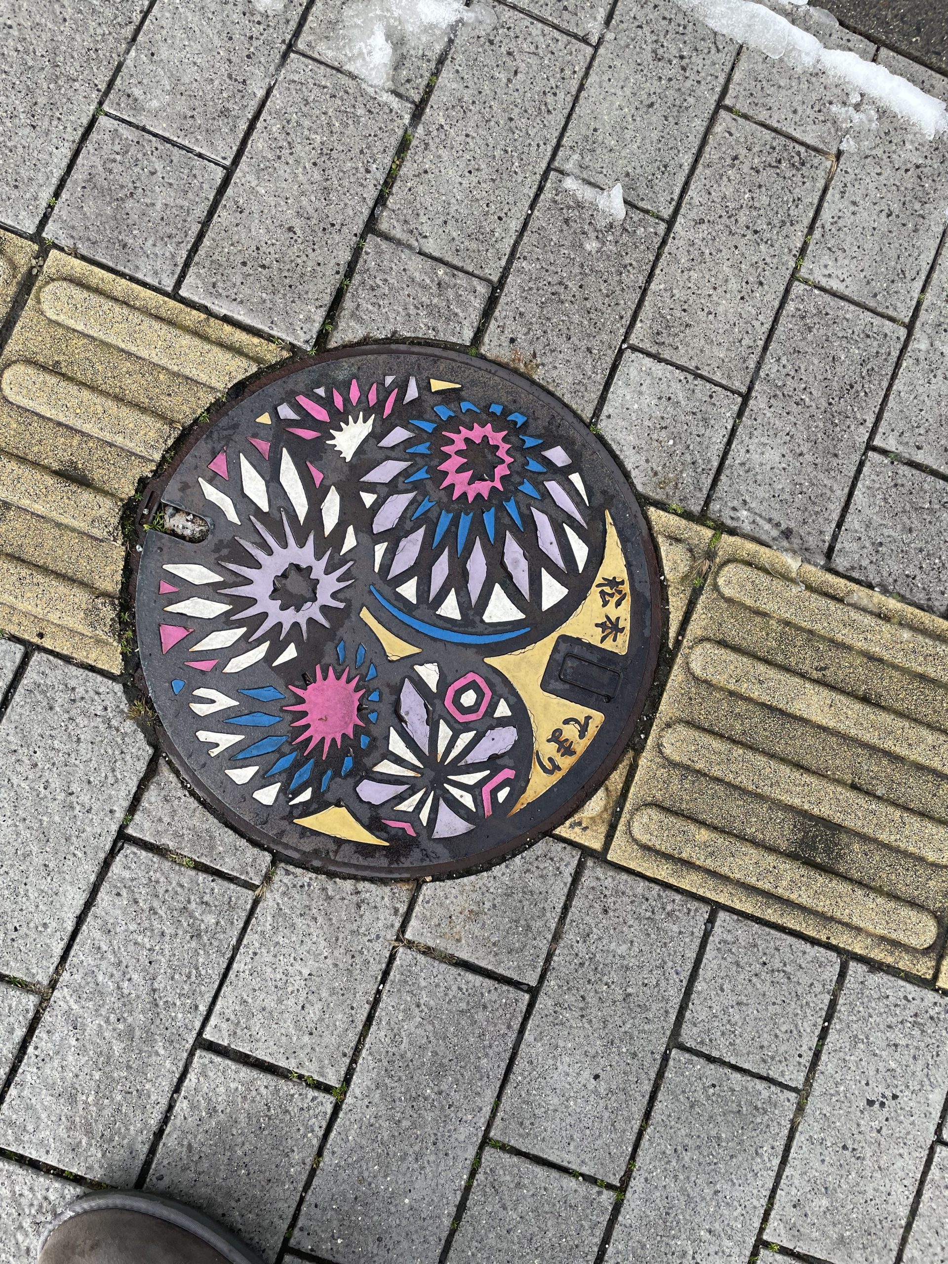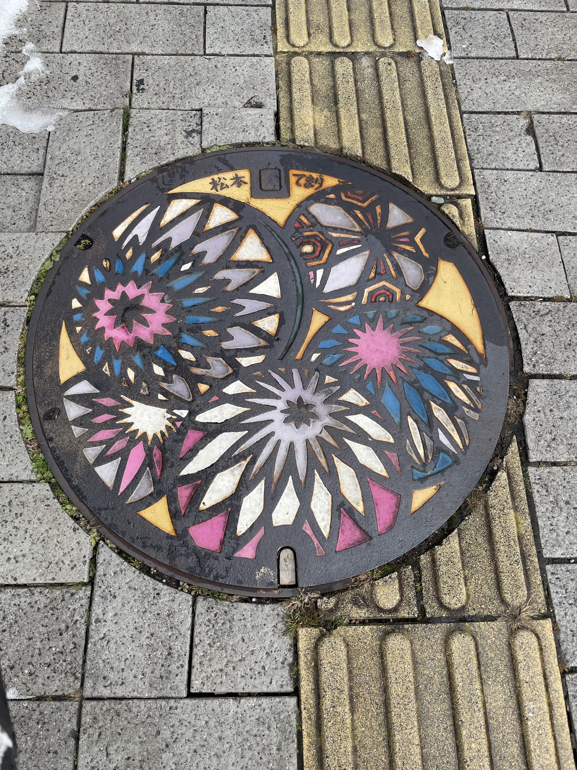 Люки с мотивами тэмари — ещё один интересный городской элемент: многие канализационные люки в Мацумото украшены красочными изображениями тэмари. Эти визуальные акценты на асфальте — часть усилий города сделать прогулки по улицам ещё более запоминающимися.Такие детали превращают обычную прогулку по городу в увлекательное открытие искусства повсюду — от площади до укромных улочек.