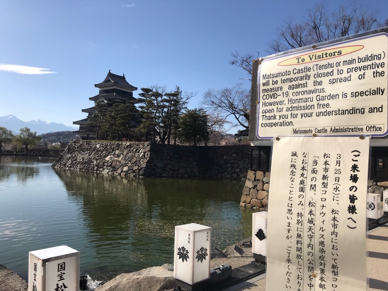 В связи с пандемией короновируса замок Мацумото, как и другие достопримечательности города, закрыт на неопределенный срок. Но вход на призамковую территорию открыт. Лишь редкие прохожие заходят взглянуть на удивительное зрелище — пустынный цветущий сад при замке.