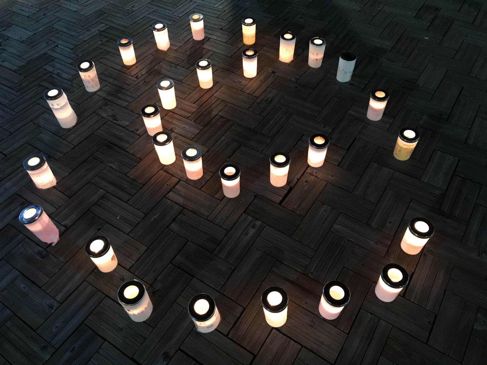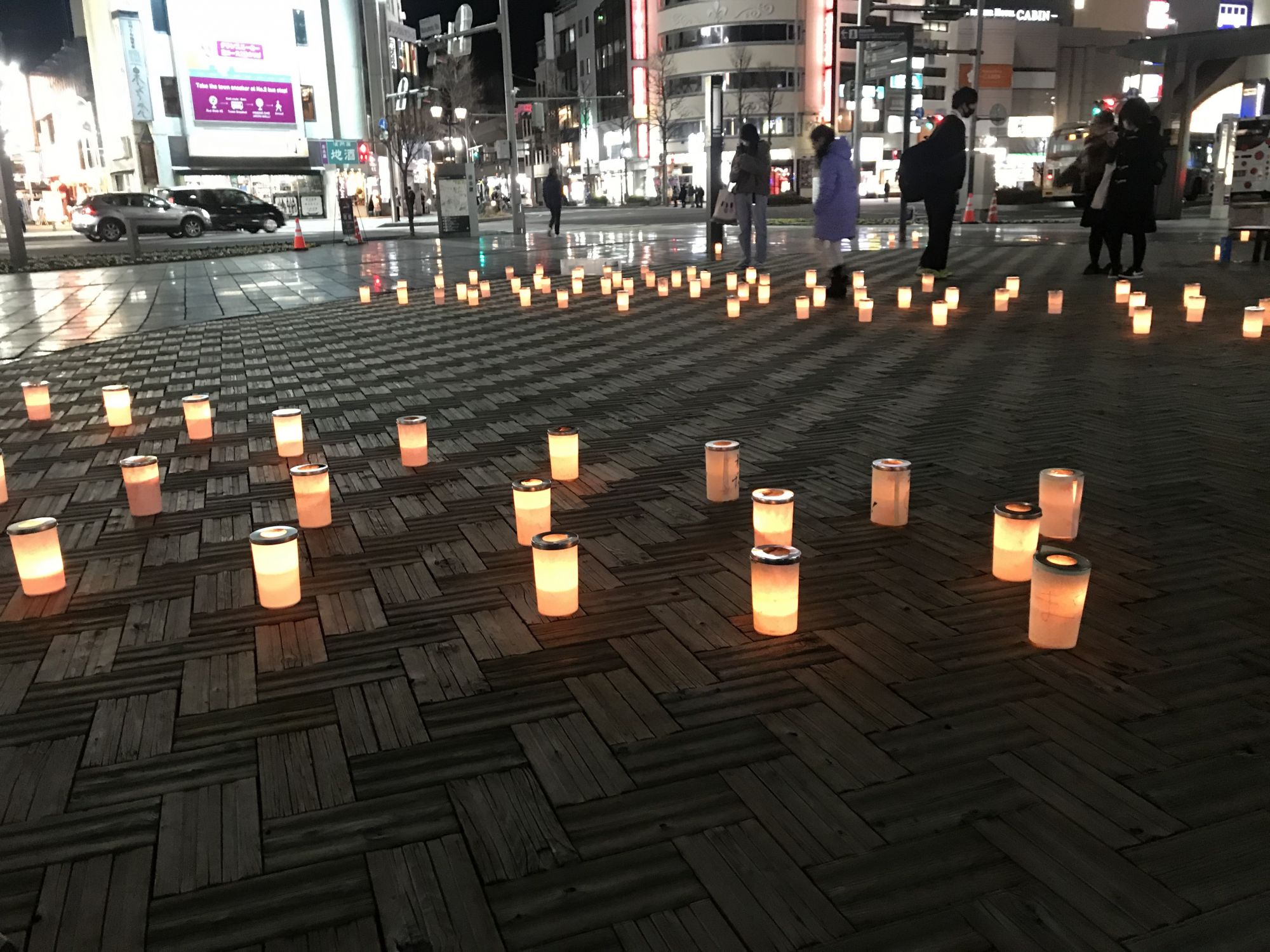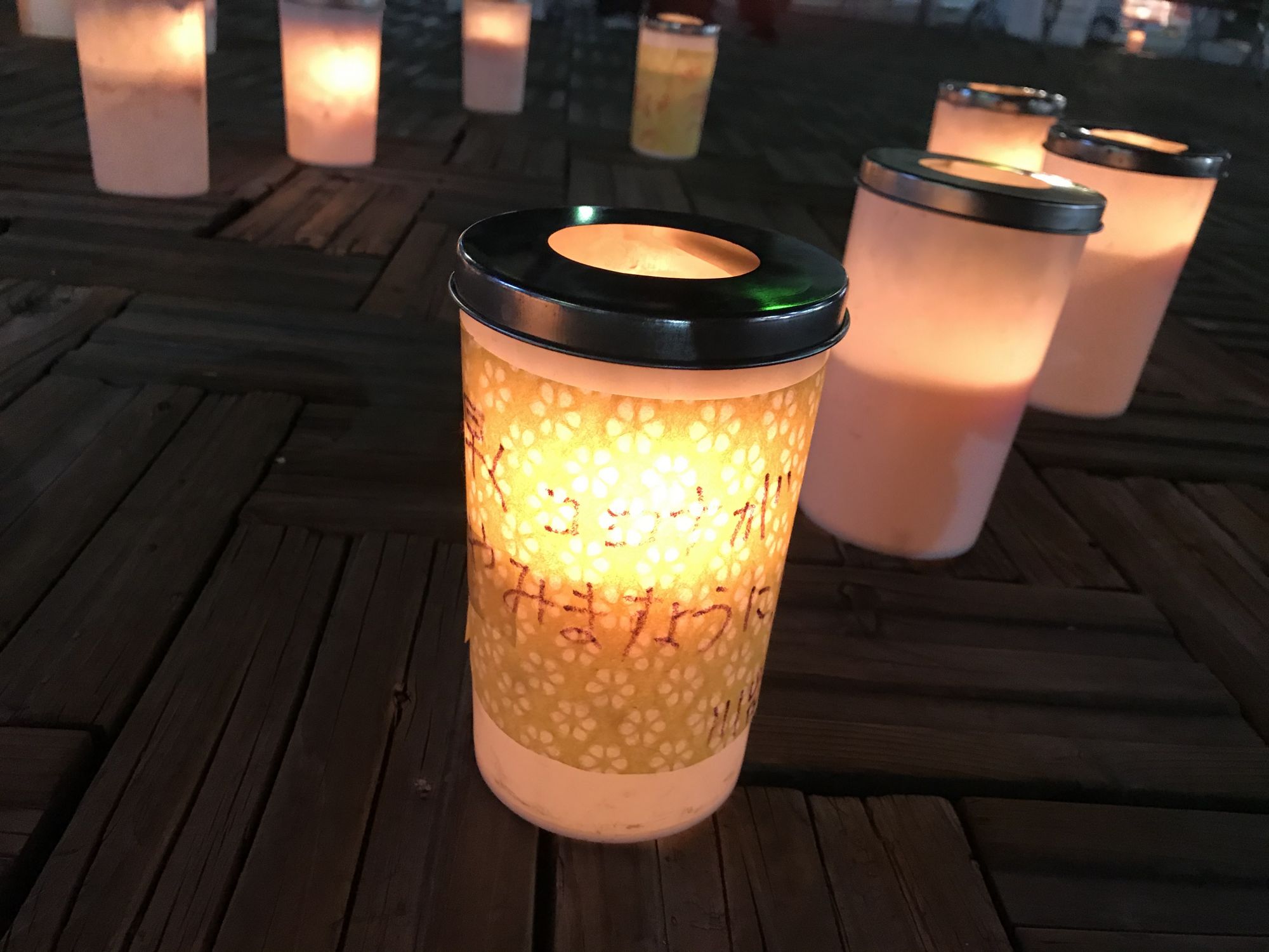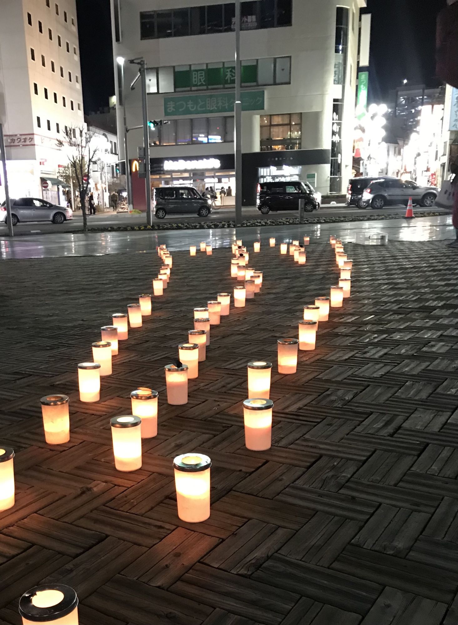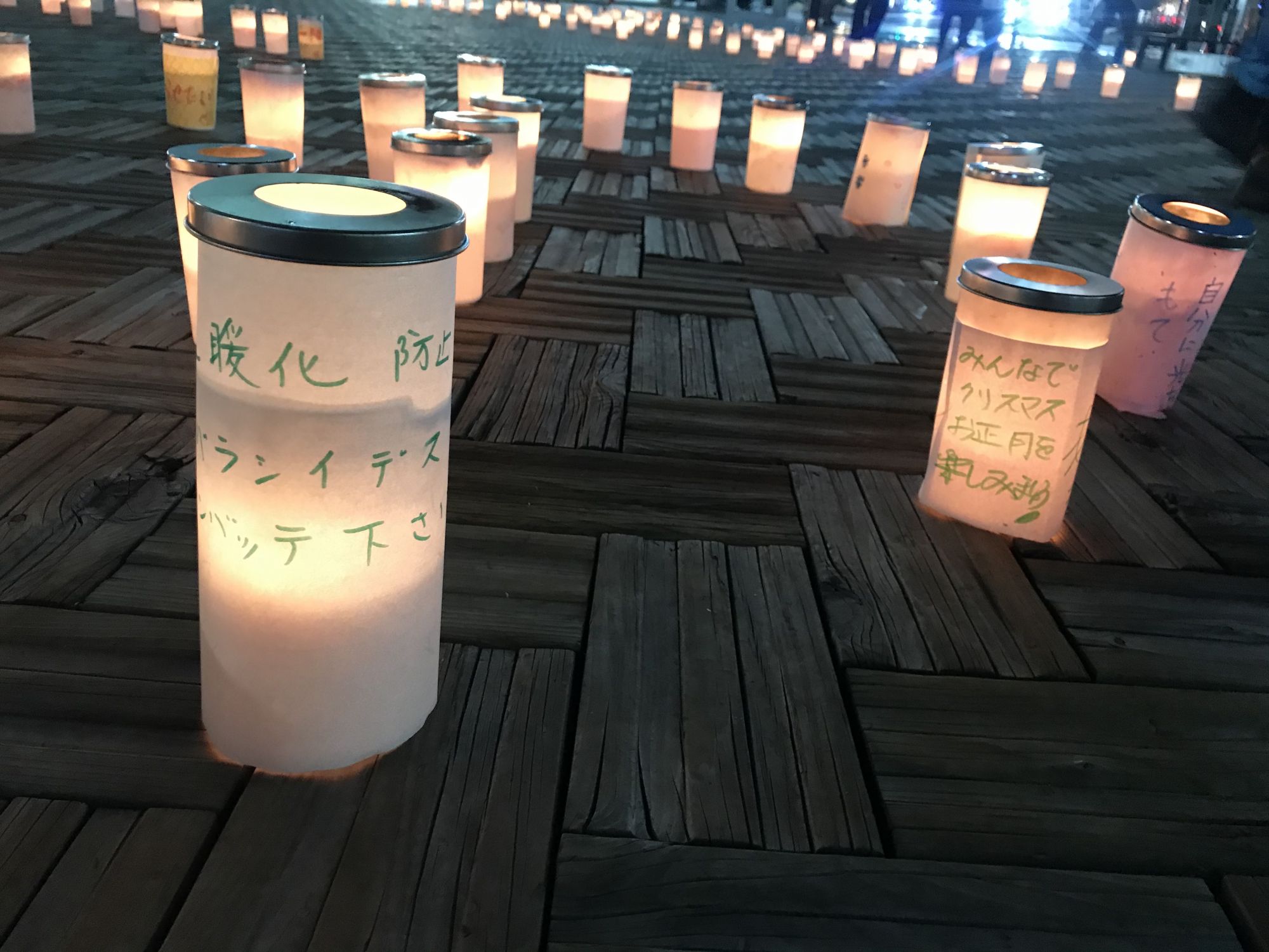 По площади расставили множество свечей в емкостях с водой и все желающие могли написать свои мечты на полосках бумаги и прикрепить к понравившейся свече.