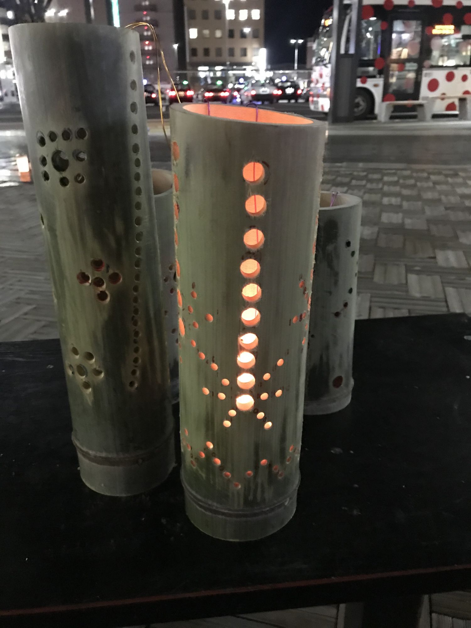 Школьники одной из городских школ специально к мероприятию изготовили подсвечники из стеблей бамбука.