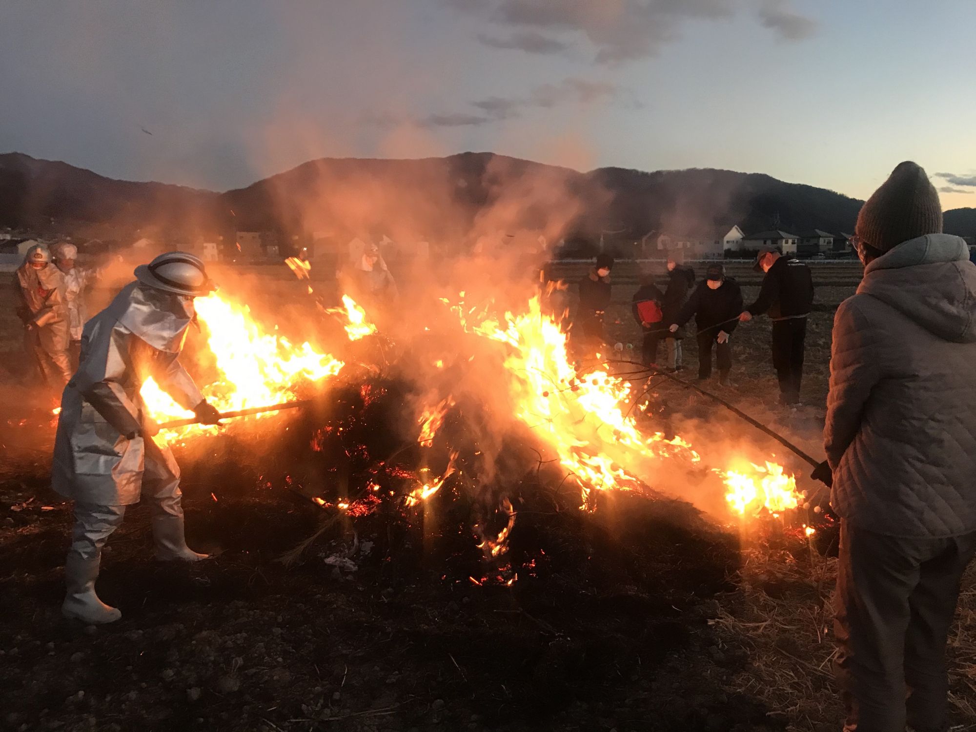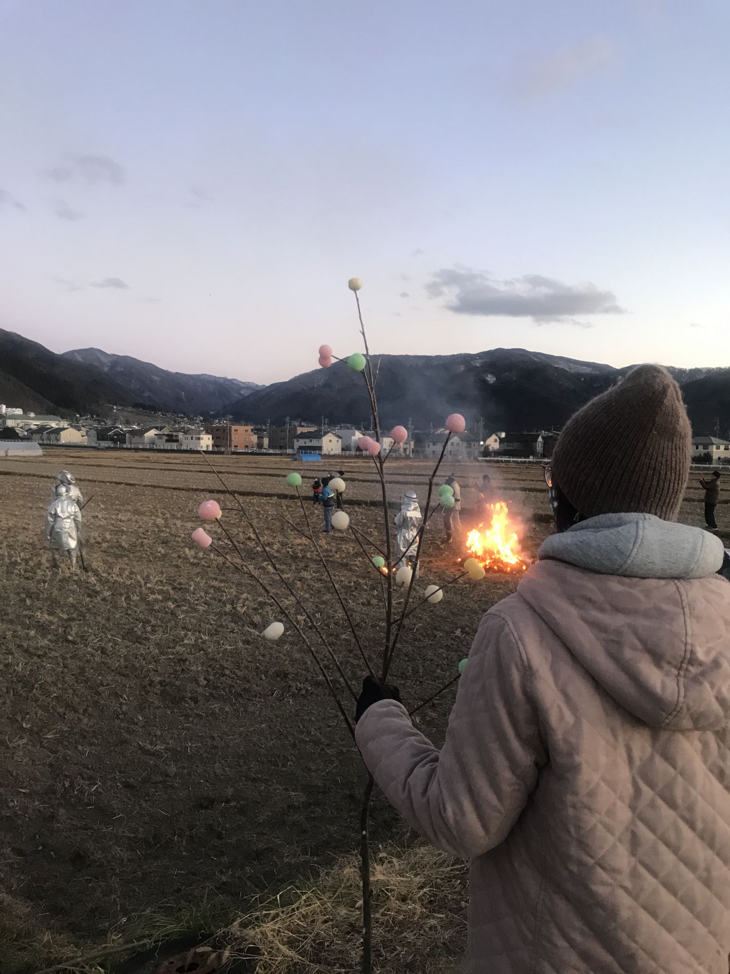 Из нескольких длинных балок сооружается высокий каркас, на который потом привязывают отслужившие свое сименыва , символы прошлого года и круглоглазых дарума. После того, как огонь утихнет, детвора (и не только) с радостью запекают над углями маюдама (небольшие шарики изготовление из рисовый муки с добавлением красителей и нанизанные на длинные ветки или прутья)