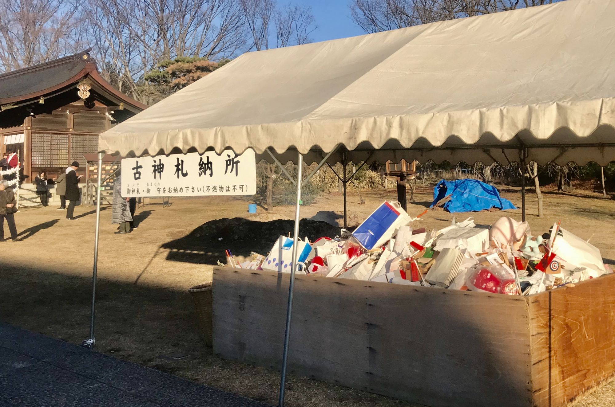 В дни Хацумоуде в храм можно принести прошлогодние обереги , а так же дарума — шарообразное божество, которому дорисовывают глаз после исполнения загаданного желания. Отработавшие своё сжигают здесь же, в специально вырытой яме под молитвы служителей храма.