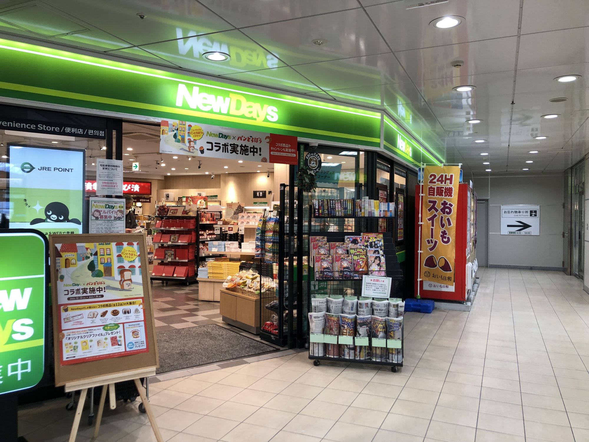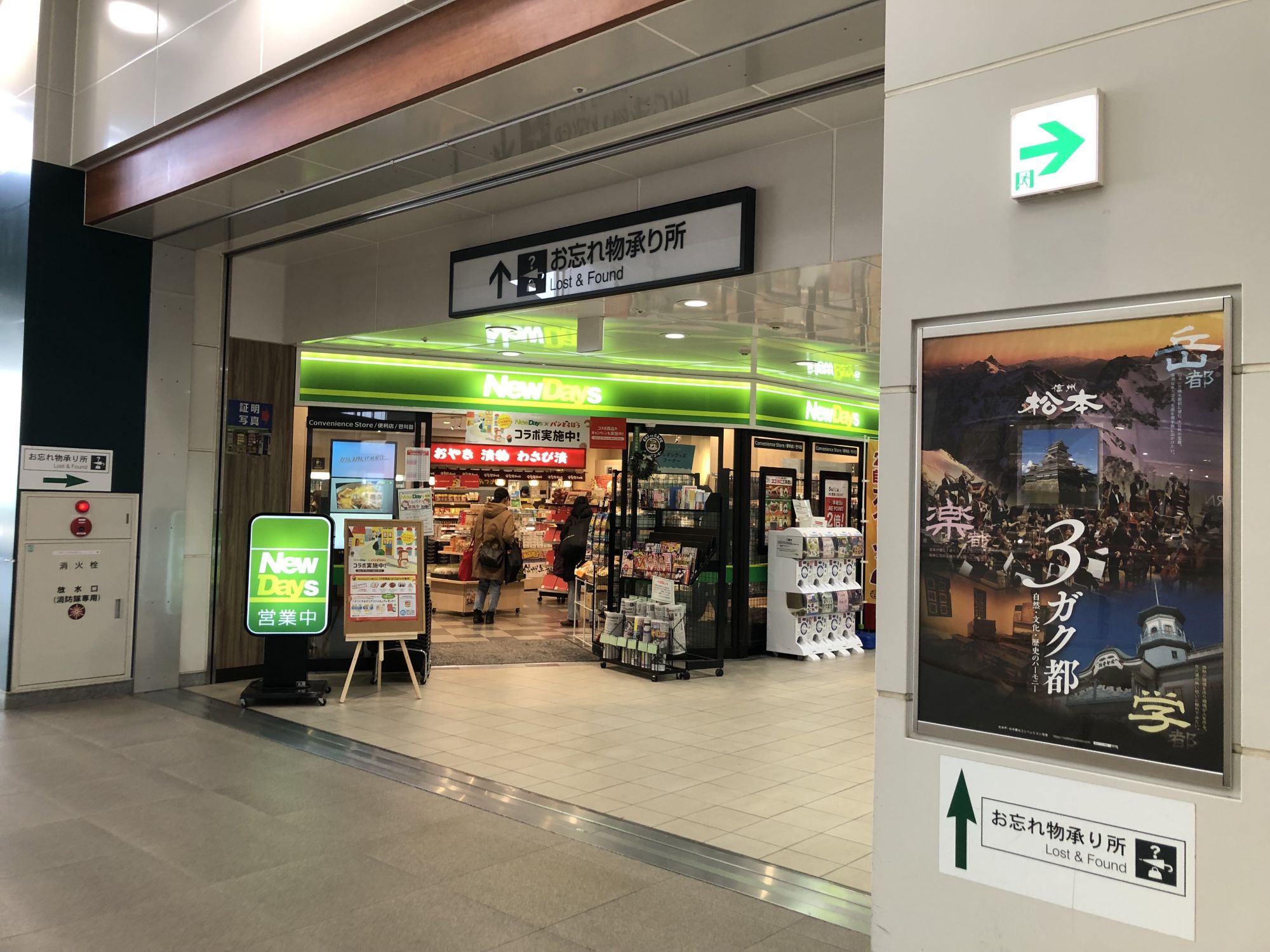 ร้าน NewDays ร้านสะดวกซื้อที่อยู่ที่ชั้น 3 ของสถานี ด้านในมีทั้งขนม น้ำดื่ม ข้าวปั้นโอะนิกิริ ขนมปัง ฯลฯ คล้ายกับร้านสะดวกซื้อทั่วไป แต่ที่นี่จะมีของฝากของจังหวัดนากาโน่วางขายด้วย