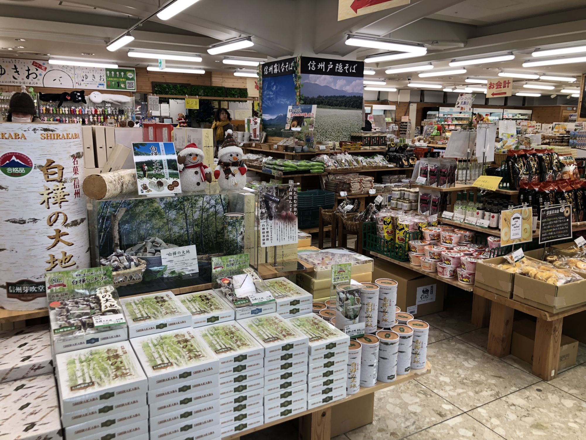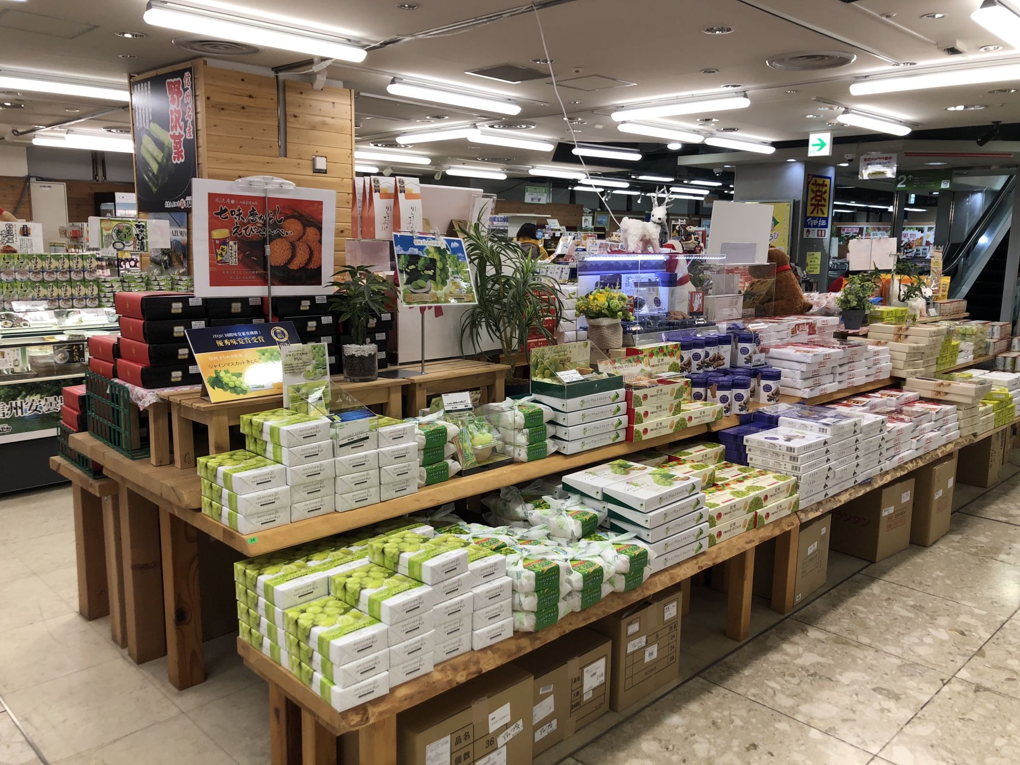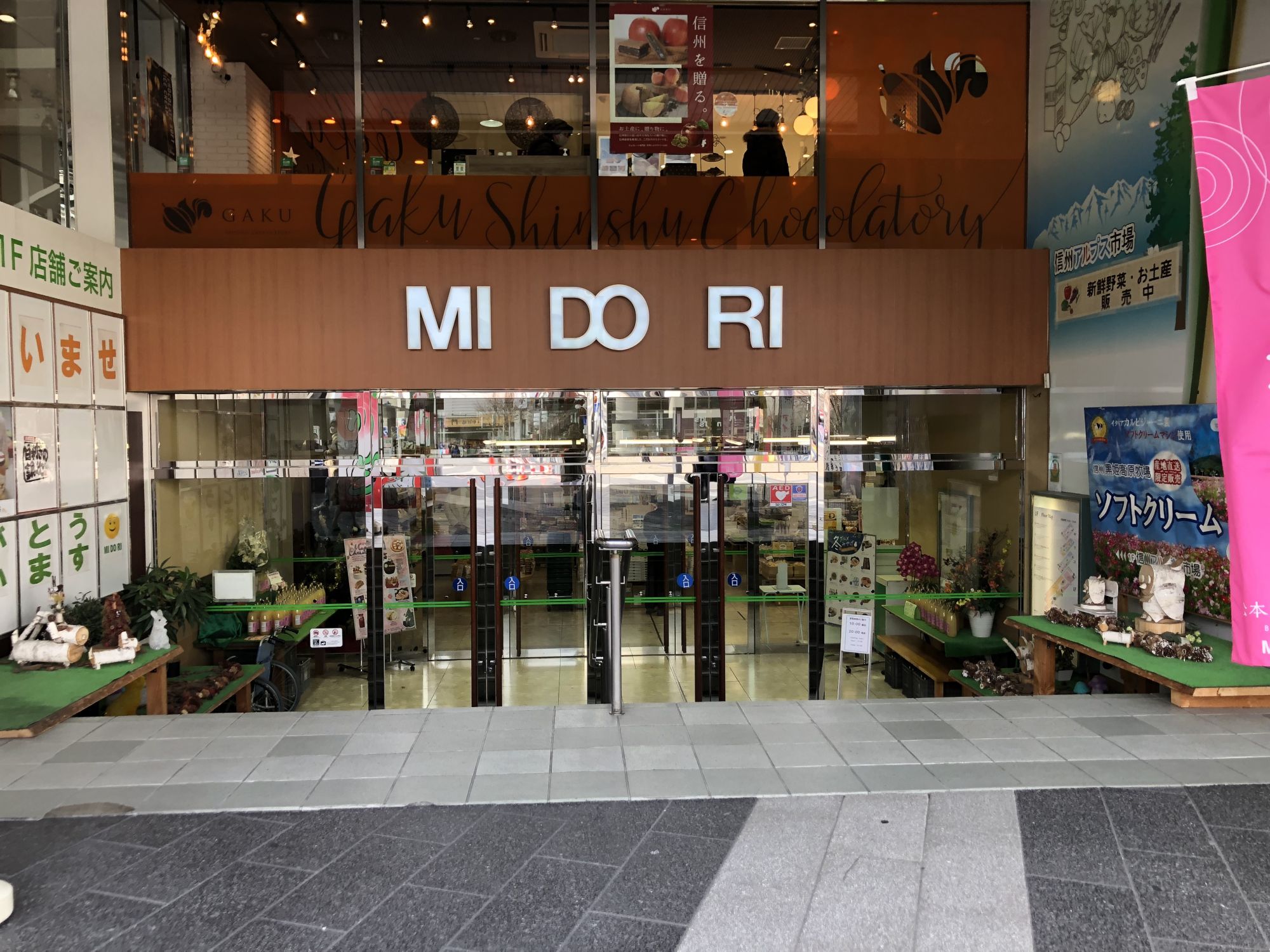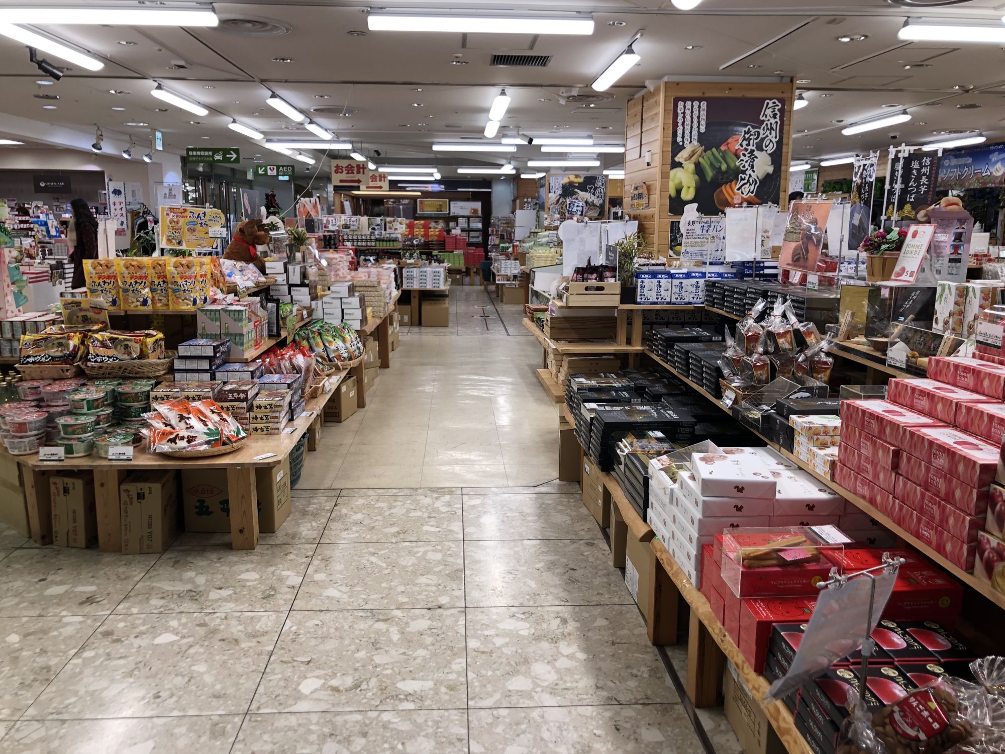 ที่ชั้นล่างสุดของห้างมิโดริ จะมีโซนขายของที่ระลึกจำนวนมาก มีสินค้าให้เลือกเยอะกว่าชั้นอื่นๆ ทั้งขนม ผักดอง โซบะ แยม มิโซะ เรียกได้ว่าเป็นศูนย์รวมของฝากในจังหวัดนากาโน่เลยก็ได้ นอกจากนี้ยังมีมุมที่ขายผักและผลไม้ตามฤดูกาลด้วย เช่น แอปเปิ้ล องุ่นไชน์มัสคัต ลูกพลับ สตอร์วเบอร์รี่ ฯลฯ