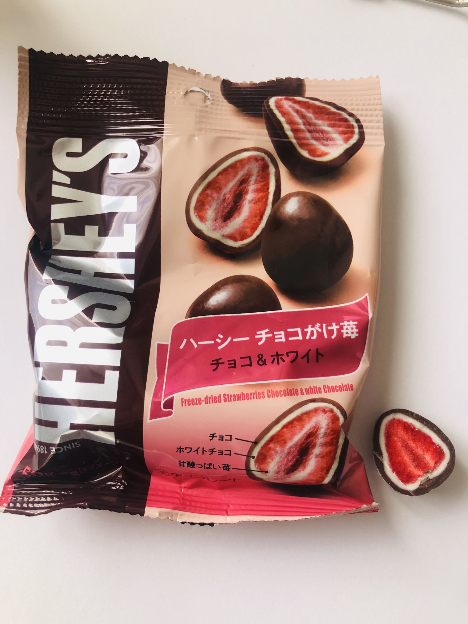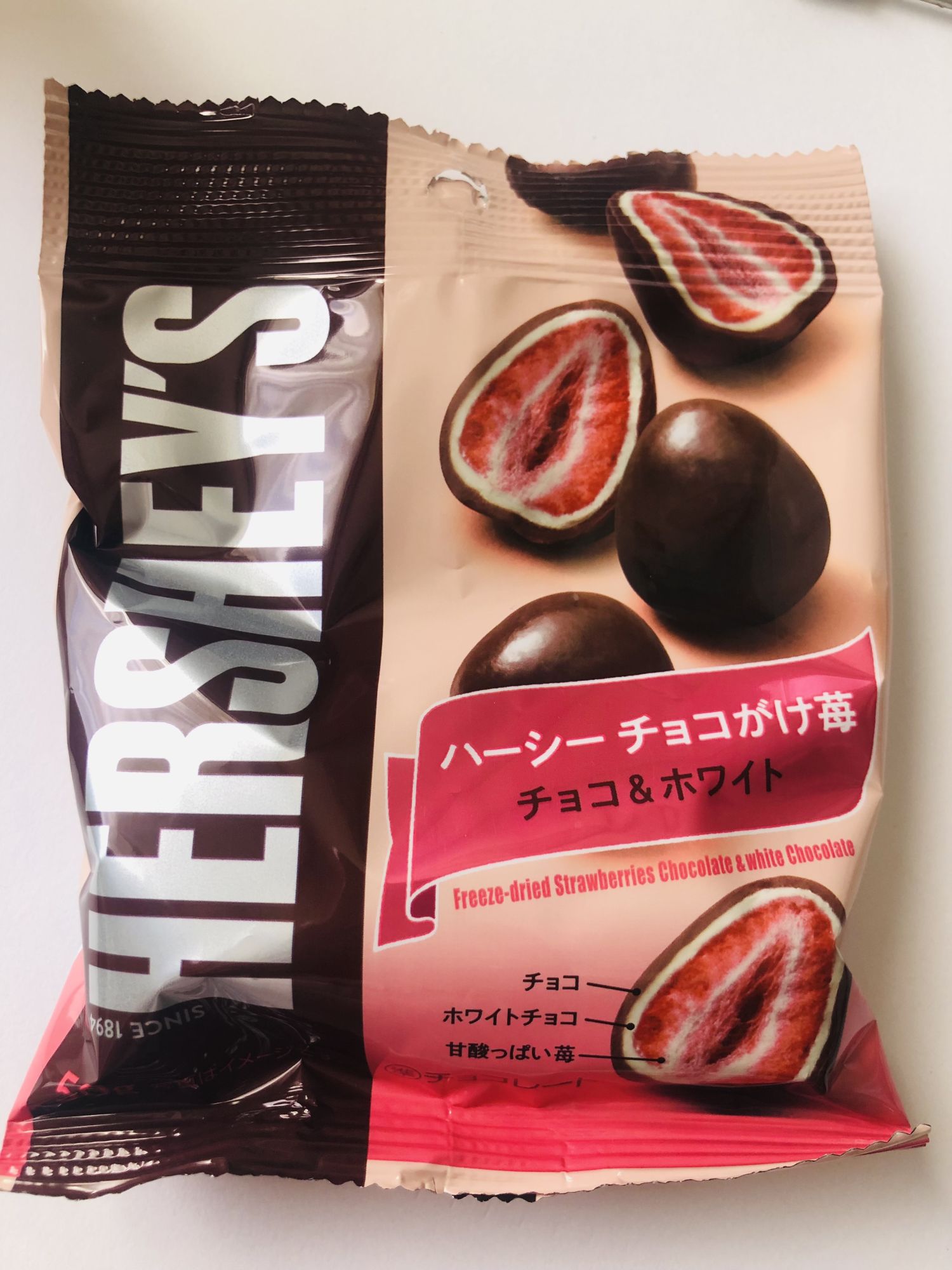 ในช่วงฤดูหนาวที่ญี่ปุ่นจะมีขนมช็อกโกแลตที่ขายเฉพาะฤดูหนาวเท่านั้น วันนี้จะขอแนะนำสตอเบอร์รี่อบแห้งเคลือบช็อกโกแลตยี่ห้อ HERSHEY’S มีวางขายทั่วไปในซุปเปอร์มาร์เก็ต ราคาไม่แพงประมาณห่อละ 320 เยนรวมภาษี (ราคาจะต่างกันเล็กน้อยแล้วแต่ร้าน) จากที่ชิมสตอเบอร์รี่อบแห้งเคลือบช็อกโกแลตมาหลากหลายยี่ห้อ ของ HERSHEY’S อร่อยราคาย่อมเยาว์ ห่อนึงมีประมาณ 5 ลูก หากใครมาเที่ยวลองซื้อชิมดูนะคะ ด้านนอกสุดเป็นช็อกโกแลต ชั้น 2 เป็นไวท์ช็อกโกแลต ด้านในสุดเป็นสตอเบอร์รี่อบแห้งออกหวานอมเปรี้ยว