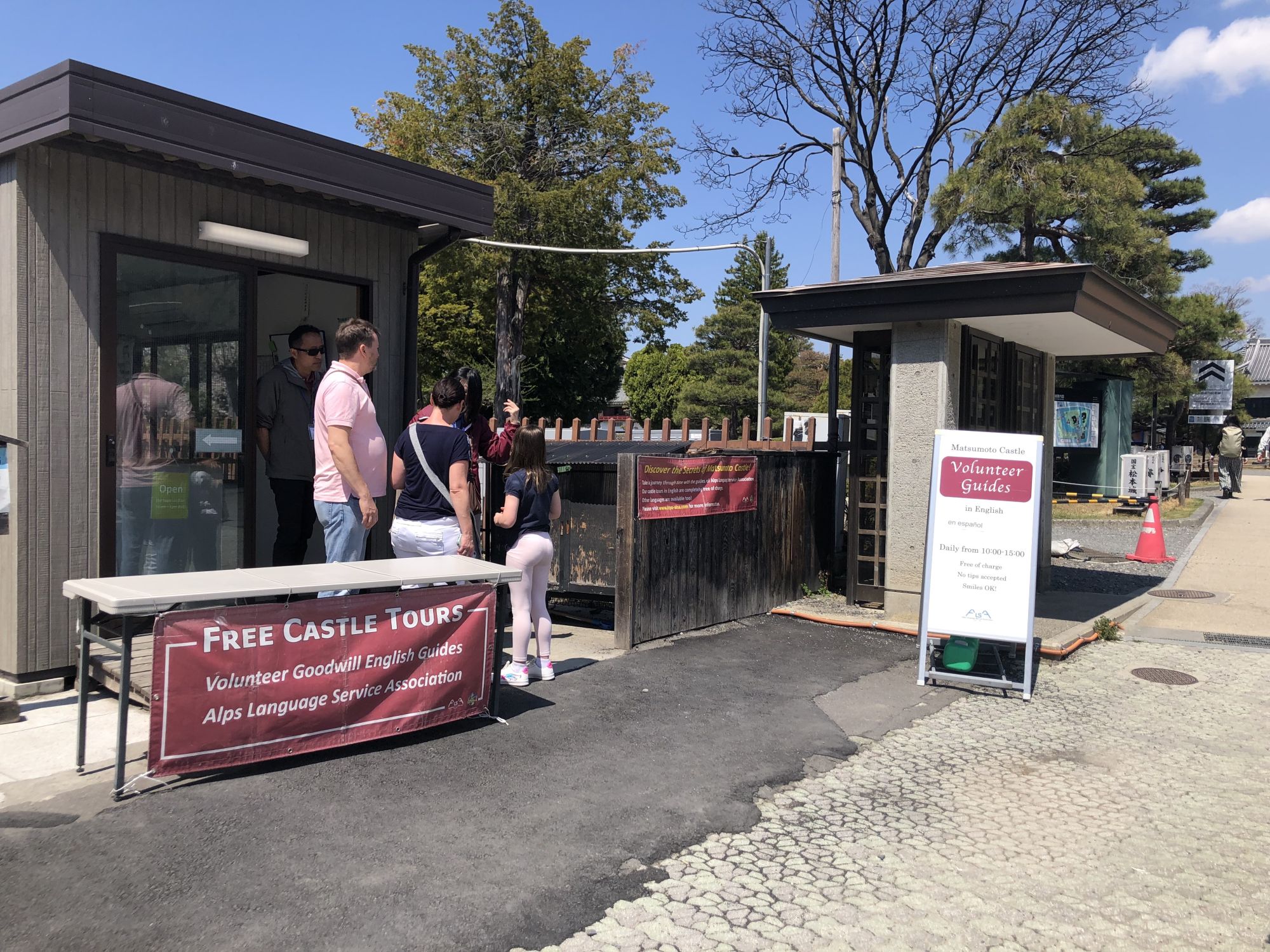วันนี้มีนักท่องเที่ยวชาวต่างชาติรวมทั้งชาวไทยมาชมดอกซากุระที่ปราสาทมัตสึโมโต้เยอะมาก หากใครที่ต้องการเที่ยวชมแบบมีไกด์อธิบาย ตรงทางเข้าปราสาทจะมีห้องเล็กๆอยู่ ด้านหน้าเขียนว่า Volunteer Guide เค้าจะมีไกด์นำเที่ยวชมปราสาทมัตสึโมโต้โดยไม่เสียค่าไกด์ แต่ถ้าหากนักท่องเที่ยวจะมอบทิปส์เล็กๆน้อยๆ ให้กับไกด์ก็ได้