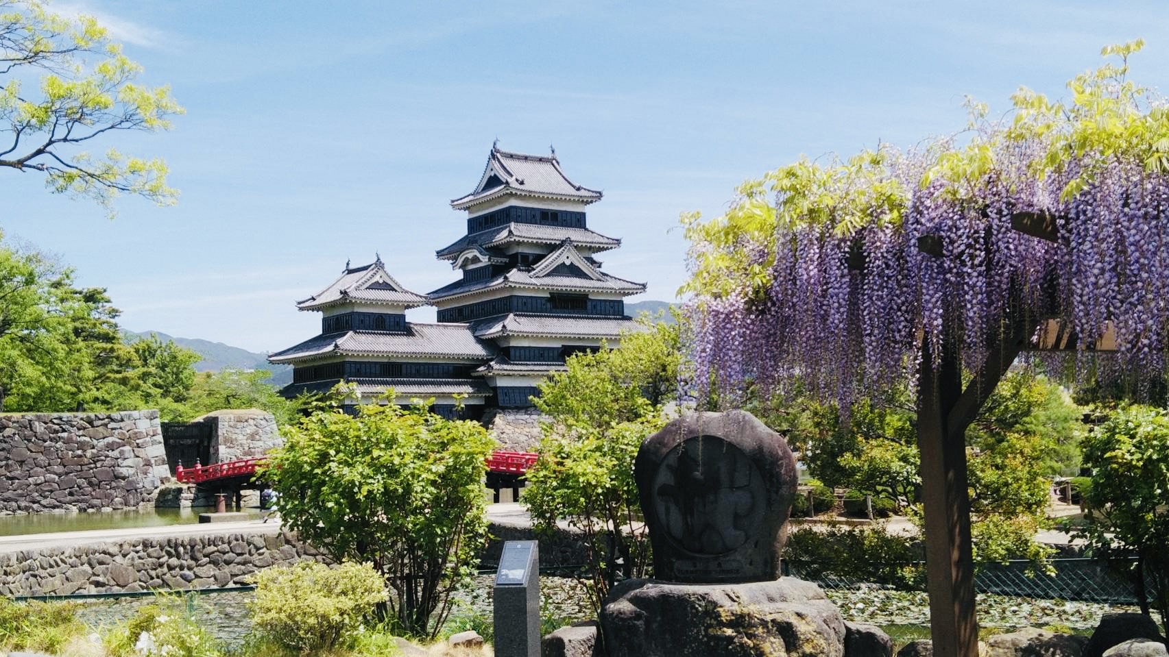 คูน้ำด้านนอกของปราสาทมัตสึโมโต้มีดอกซากุระจำนวนมาก  และจะบานสะพรั่งในฤดูใบไม้ผลิ. ประมาณปลายเดือนเมษายน ดอกวิสทีเรียจะบานสะพรั่งไปด้วยดอกไม้สีม่วงสวยงามในสวนของปราสาทมัตสึโมโต้