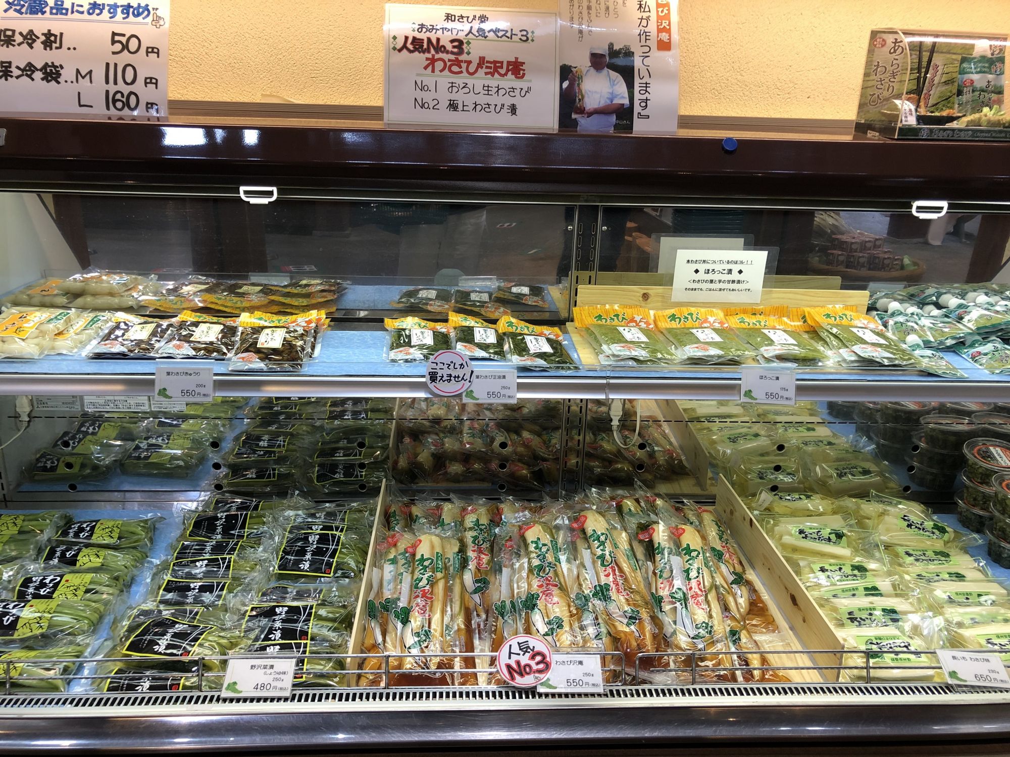 สามารถซื้อผักดอง ลูกอม อาหาร และขนมรสวาซาบิได้ที่ร้านขายของที่ระลึก ทานไอศครีมรสวาซาบิที่ร้านขายไอศครีม หรือจะชิมอาหารที่ทำจากวาซาบิที่ร้านอาหารก็ได้