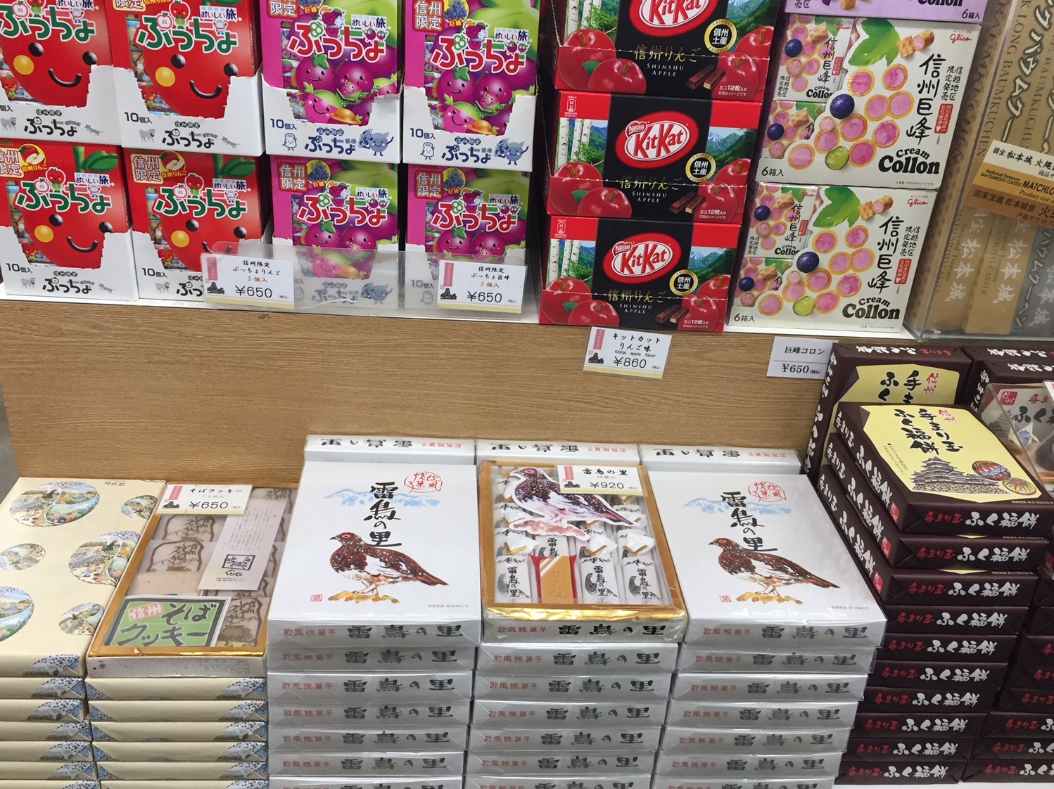 ขนมขบเคี้ยวยอดฮิตตลอดกาลที่เด็กทานได้ผู้ใหญ่ทานดี ได้แก่ คิทแคทรสแอปเปิ้ลซึ่งหวานหอมกลิ่นแอปเปิ้ลมากๆ โคล่อนรสองุ่นพันธ์เฮียวโค คุกกี้คันทรีมัมผสมช็อคโกแลตชิปเนื้อคุกกี้มีสองรส ได้แก่ รสองุ่นสีม่วงพันธ์เคียวโฮและรสแอปเปิ้ล ป๊อกกี้รสองุ่นพันธ์เคียวโฮ ฯลฯ นักท่องเที่ยวอาจพบเห็นขนมดังกล่าวตามซุปเปอร์มาร์เก็ตทั่วๆ ไปในประเทศญี่ปุ่น แต่รสองุ่นพันธ์เคียวโฮและรสแอปเปิ้ลชินชูจะมีจำหน่ายเฉพาะพื้นที่จังหวัดนากาโน่เท่านั้น นอกจากคิทแคทรสแอปเปิ้ล โคล่อนรสองุ่นและคุกกี้คันทรีมัมแล้ว ก็ยังมีขนมชนิดอื่นๆ ที่นักท่องเที่ยวนิยมซื้ออีกมากมายได้แก่ ขนมเวเฟอร์สอดไส้ครีมที่กล่องมีรูปนกไรโจ ซึ่งเป็นนกที่สามารถพบเห็นได้ในบริเวณที่ราบสูงเท่านั้น ขนมมันจู ขนมดังโกะ เค้กแอปเปิ้ลและขนมคินสึบะไส้ถั่วดำ เป็นต้น