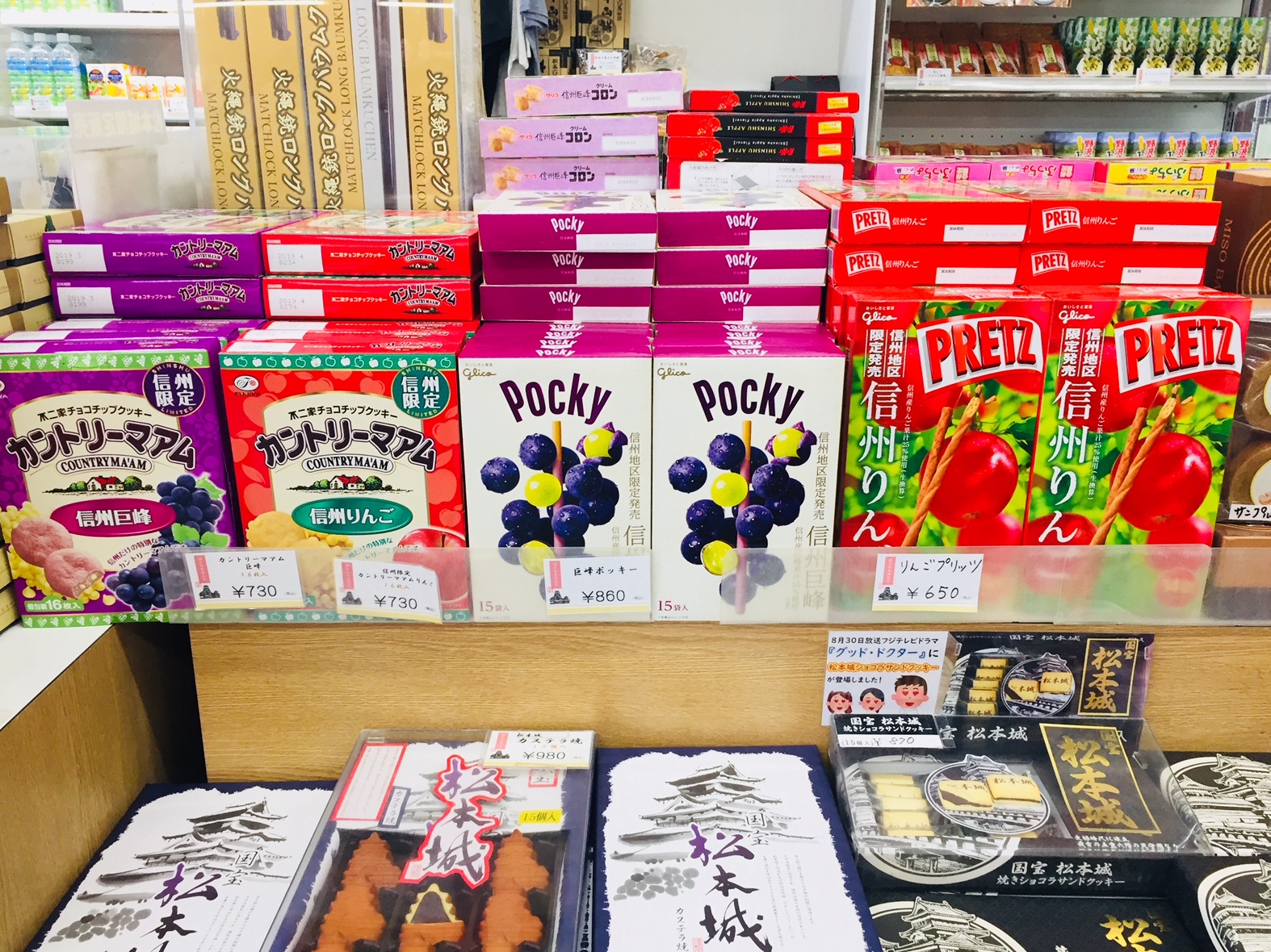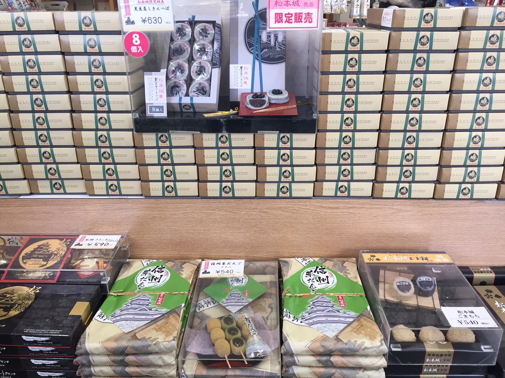 สถานที่ท่องเที่ยวหลายแห่งในประเทศญี่ปุ่นมักจะมีของฝากเฉพาะท้องถิ่นจำหน่ายในแต่ละเมือง ส่วนใหญ่จะนำผลิตภัณฑ์ในท้องถิ่น เช่น ผลไม้ ผัก เนื้อวัว ผลิตภัณฑ์จากนม โมจิ ซึ่งเป็นผลิตภัณฑ์ที่มีชื่อเสียงของท้องถิ่นนั้นๆ มาแปรรูปเป็นของฝากที่มีขายเฉพาะเมืองหรือเฉพาะท้องถิ่นนั้นๆ เมืองมัตสึโมโต้เองก็มีของฝากที่น่าสนใจหลายอย่าง ในวันนี้จะพาไปชมของฝากบางส่วนที่ขายในร้านขายของฝากที่ปราสาทมัตสึโมโต้