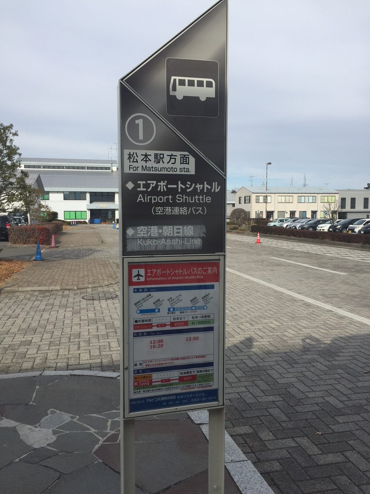สำหรับรถบัสจะจอดที่ป้ายหมายเลข 1 มีทั้งหมด 3 เที่ยว/วัน จากสนามบินมัตสึโมโต้ไปยังใจกลางเมืองใช้เวลาประมาณ 30 นาที รถออกเวลา 12.00 น. / 12:50 น. / 16:20 น. ค่ารถบัสจากสนามบินไปยังตัวเมือง 600 เยน