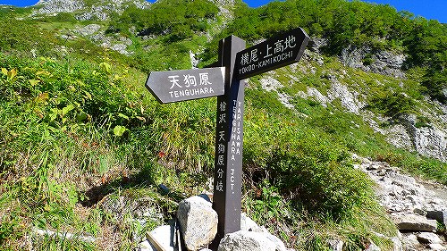 「天狗原・分岐点」にある分岐の看板です。ここで槍ヶ岳コースから外れて、「天狗原」を目指して歩いて行きます。 上記のツバメ岩の横をすり抜けるようにして登って行くのです・・・・。 登りが落ち着いてくると・・・・、
