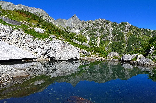 「南岳」は百名山とかではないので、ここまで来る人があまりいませんので、静かな登山が楽しめます。 そしてこのコースの魅力は何と言っても槍ヶ岳が逆さに映る「天狗池」でしょう!! 天狗池は1年で9月の約一ヶ月半程しか姿を現しません!冬~春は雪に覆われていて、10月になるともう次の雪が降って来て凍りつきます・・・。旬がとても短い池なので、この時期の晴れた日にしか、逆さ槍ヶ岳はみえないのです! この見る事が出来る時期があまりに短い「天狗池」~と「南岳」コース、岳人なら一度は行ってみたい場所なのです。
