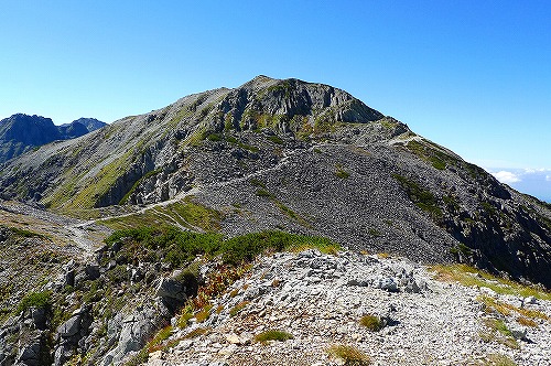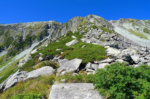 かなりの岩場の急登を登り切ったら、北アルプスの稜線に到着です! ここまで来たら目指す「南岳」がもう目の前になります!。あとほんの少しだけ、画像に見える登山道沿いに歩けば、南岳に到着します!・・・。
