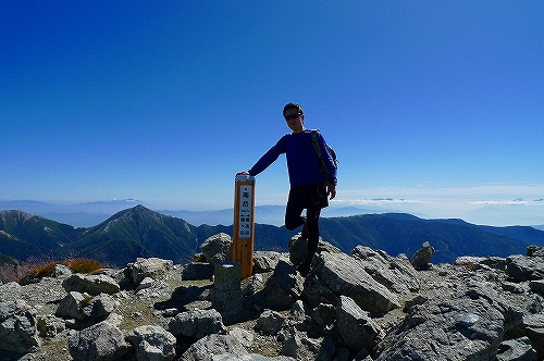 そして、やっと南岳(3032m)に到着しました~!! 快晴の真っ青な空に、見える素晴しい山岳景色に、思わず感動します!左後ろは常念岳です。