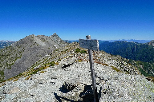 北側を見ると、南岳山頂から見える槍ヶ岳と山頂の看板です。 北アルプスの稜線上の素晴しい景色です!