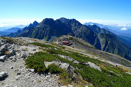 南側を見ると向こうに奥穂高岳~北穂高岳、その前に大キレット、そして手前に南岳小屋が見えます! こちらも岩稜の北穂高岳が素晴しい景色です!