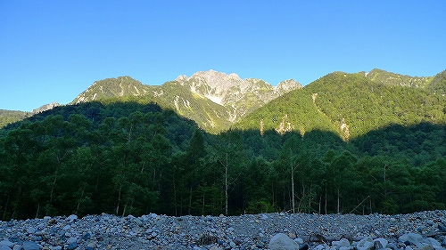 画像は早朝の上高地で朝日が穂高連峰に当たっているところです。上高地からは、河童橋を越えて登山道を一路「横尾」まで、梓川沿いに 明神~徳澤~横尾 と、歩いて行きます・・・。