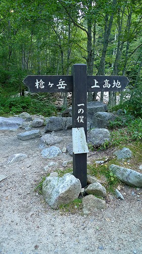 「横尾」は、涸沢方面と槍ヶ岳方面の分岐点なのです!。 ここからは、一路「槍ヶ岳方面」を目指して歩いて行きます。 画像は横尾の先にある「一の越」というところです。吊り橋が掛っているきれいな沢のあるところです。ここからさらに先へ進んで行きます・・・。