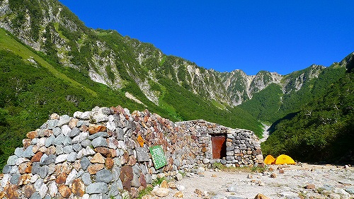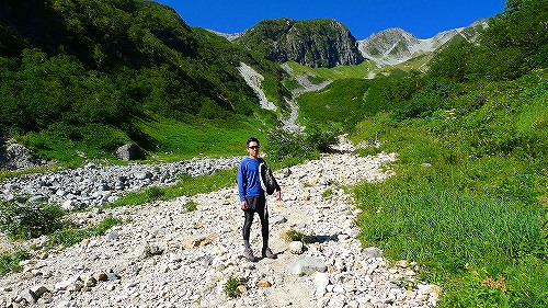 槍沢ロッジを越えると、やっと「槍沢」の下部にでます。 画像は「槍沢キャンプ場」です。ここからはこの画像の槍沢沿いに、奥まで歩いて行きます。ここから先は沢がひらけていて、稜線に見える山がとても綺麗に見えてきます・・・。
