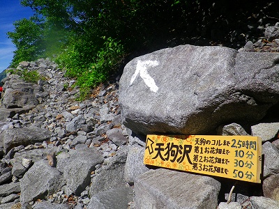 「岳沢小屋」から「天狗沢」へは、小屋の左手裏にあるこの登山道入口の看板から登って行きます・・・。この登山道から先は、登山の熟練者であるエキスパートのみに許される上級のヴァリエーションルートになります。