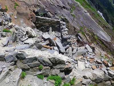 しかし、お花畑より上の「天狗沢」の上部は、岩がガレている超急斜面のため上級者オンリーのルートになります!! この辺りは「滑落」や「落石」での遭難がよく起こる、危険なルートのようです・・・。