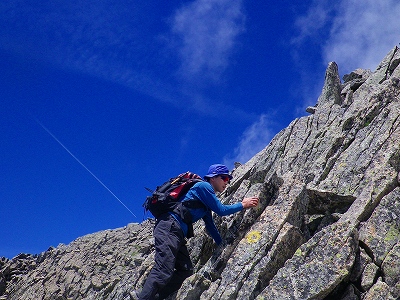 そして、最後の最後に来るのは、このヴァリエーションルートの最大の難所である「馬の背」というナイフリッジ状の岩場です!! ここは本当に文字通り”ナイフリッジ”で、両側が遥か下方まで切れ落ちていて、その尖った稜線の僅かな岩の窪みに手や足を掛けて登って行くルートになっていました!!
