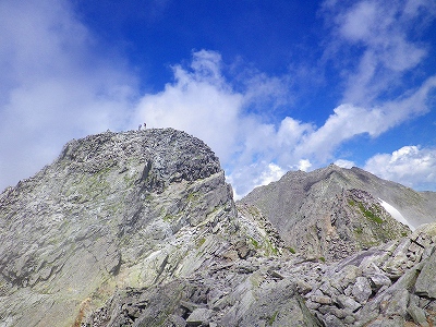 そして「畳岩」セクションを登り切って少し進むと・・・、やっと今回の目的の一つである「ジャンダルム」が姿を現しました~!! 左がそのジャンダルム、右の少し尖ったのが奥穂高岳の山頂です。ジャンダルムは南側からみるとこんな感じに見えるのです・・・。奥穂高岳から見えるジャンダルムのあのドーム型の岩稜の容姿は、登山者を寄せ付けないような迫力があるのですが、反対側から見るとかなり形が違って見えるのも面白いと思いました。