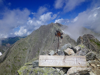 そして「ジャンダルム」(3163m)に登頂成功です~!! ジャンダルムの山頂には、こんな「ジャンダルム」の木の看板と、なぜか針金で造られた「天使」(?)のような飾りがありました・・・。