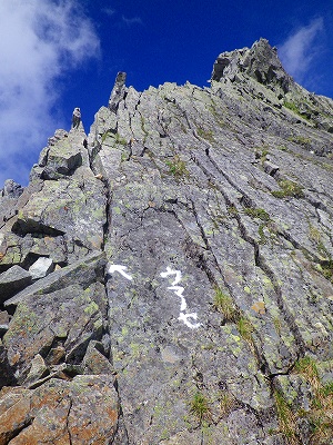 「ジャンダルム」には、南側(西穂高側)から登ることが出来るのです。ちゃんとルートを示す印も付いていて、ここまでの岩場に比べたら比較的簡単に登頂出来ます。この「ジャン」というサインを左側に巻いて登って行くのです。