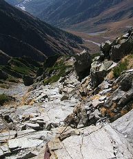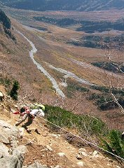 後半には、ザイルを頼りに下りる部分があります。「カモシカのお立場」という名前の岩があり、最後の長い長いジグザグの下りを下りると岳沢です!