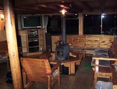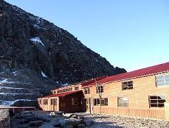上高地から約8時間、穂高岳山荘に到着。山荘は外側はきれいで、中には、薪ストーブやランプが心地よい休憩室があります。