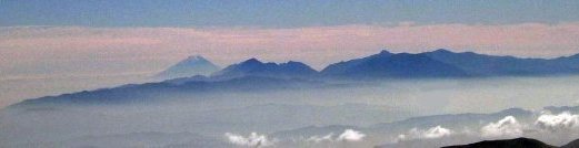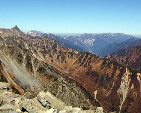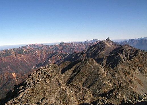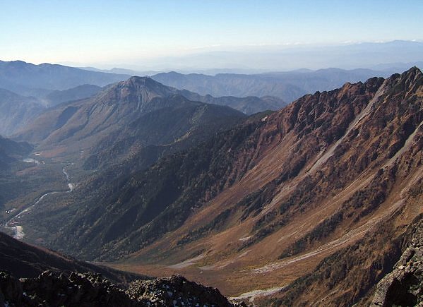 写真:前穂高岳山頂から見た上高地・焼岳・乗鞍・御岳山